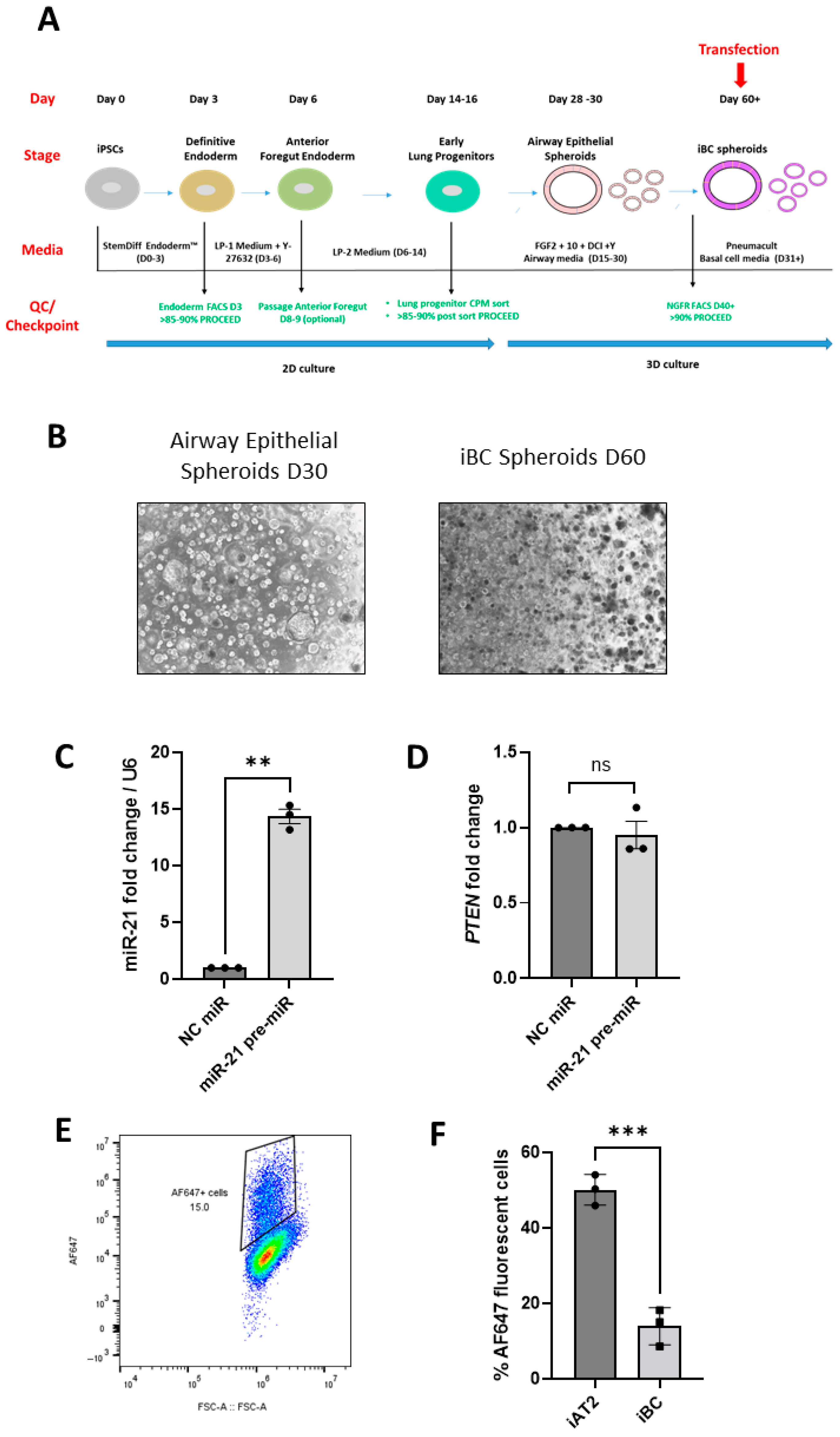 Figure 3. miRNAs can be transfected ‘in situ’ in iBC spheroids. (A) Schematic diagram of the iPSC differentiation towards iBC spheroids. The days of the protocol, stages of differentiation, media used, and quality control (QC)/checkpoints are highlighted in the figure. (B) Bright-field images of Airway Epithelial spheroids (Day 30 of the differentiation protocol; single-cell-layer spheroids) and iBC spheroids (Day 60 of the differentiation protocol; denser and more compact spheroids). (C) miR-21 and (D) PTEN mRNA levels measured after transfection of miR-21 pre-miR mimics (50 nM; 48 h) into iBC spheroids (n = 3 independent experiments, at least in duplicate). Data are expressed as mean ± SD (NC mimic-transfected samples are set at 1). p-values are reported according to paired t-tests. (E) Representative flow cytometry graph of the ‘in situ’ transfection efficiency in iBC spheroids. (F) Comparison of the % of AF647-positive cells upon transfection with fluorescently labelled siRNA of iAT2 (n = 3, in triplicate) vs. iBC spheroids (n = 3, in single). Data are expressed as mean ± SD. p-values are reported according to unpaired t-tests. p-values are reported on the graph as following: ns = not significant, ** p < 0.01, *** p < 0.001.