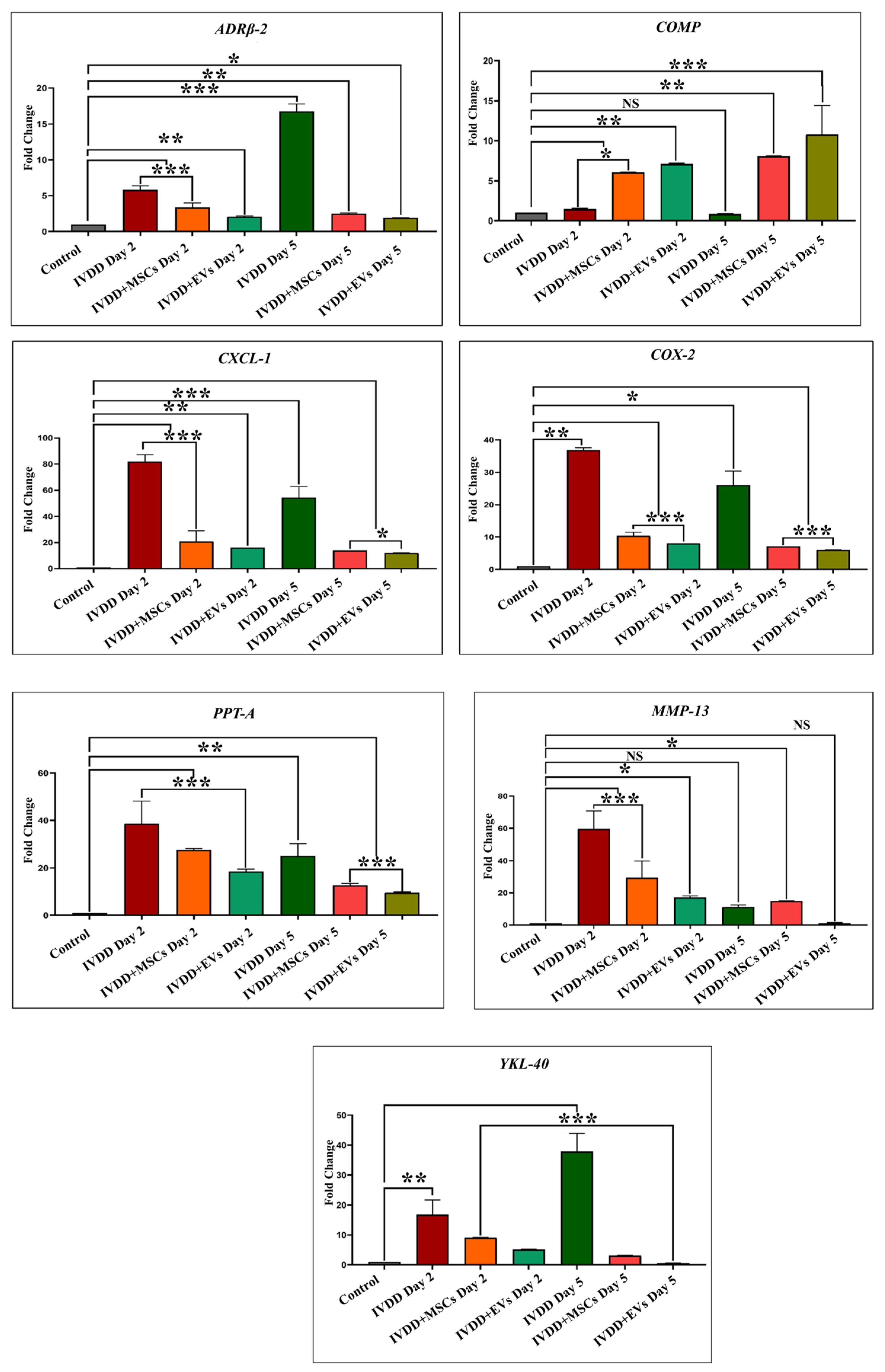 We investigated the effect of pain and inflammatory markers on degenerative and repair processes in NP that play critical roles in cellular survival, homeostasis, and chondrogenesis by analyzing genes to compare hUC-derived MSCs and hUC-MSC derived EVs transplanted groups. These involve Adrenoceptor beta 2 (ADRβ2), cartilage oligomeric matrix protein (COMP), cyclooxygenase-2 (COX-2), preprotachykinin-A (PPT-A), C-X-C motif chemokine ligand 1 (CXCL-1), matrix metalloproteinase 13 (MMP-13), and chitinase-3-like protein 1 (YKL-40) markers. Our qPCR showed the mRNA expression patterns of these markers in healthy IVDs and degenerative discs transplanted with hUC-MSCs and EVs. We explored an overall profile that seems to be dependent on the period of IVDD. In the control IVDs, seven genes (ADRβ2, COMP, CXCL-1, COX-2, PPT-A, MMP-13, and YKL-40) were expressed. Elevated expression of ADRβ2, CXCL-1, COX-2, PPT-A, MMP-13, and YKL-40 was observed during the establishment of a disc degenerative model with varied patterns at different degeneration intervals. In general, we observed a steady increase in the expression level as the time of deterioration increased. The expressions of ADRβ-2 and YKL-40 were reduced after 24 h compared to days 2 and 5, but increased after day 5 of degeneration. COMP expression was significantly increased following 24 h of degeneration. COMP expression level recovered to baseline after day 5. COX-2 expression increased on day 1 and then steadily declined on days 2 and 5. CXCL-1, PPT-A, and MMP-13 had high expression levels in the degenerative IVDs on days 1 and 2, but their levels steadily declined during the next 5 days of degeneration. It indicated that these genes mediate the degenerative IVD event in a time-dependent manner.