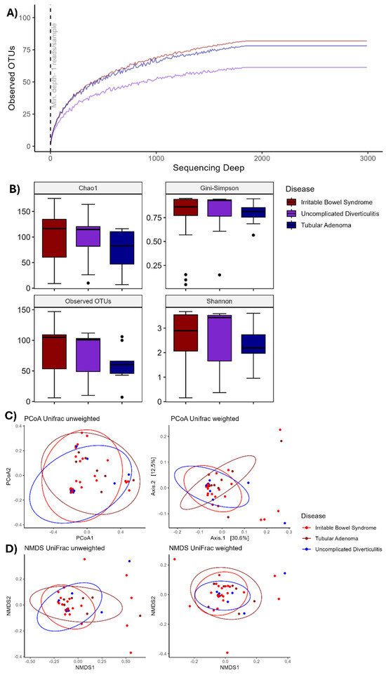 Analysis of the differences in the alpha and beta diversity. (A) Rarefaction analysis to evaluate a sufficient sample. (B) Analysis of the differences in the observed alpha diversity and Chao1, Shannon, and Gini–Simpson indices among patients with irritable bowel syndrome, uncomplicated diverticulitis, and tubular adenoma. There was a significant difference in each comparison (p < 0.001). (C) Beta diversity analysis via the weighted and unweighted UniFrac methods revealed no separation between the microbial populations present in samples from patients with irritable bowel syndrome, uncomplicated diverticulitis, and tubular adenoma. (D) Beta diversity analysis using the weighted and unweighted UniFrac methods revealed no separation between the microbial populations present in samples from patients with irritable bowel syndrome, uncomplicated diverticulitis, and tubular adenoma.