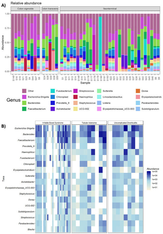 Analysis of taxonomic composition. (A) Relative abundance at the genus level of the total taxonomic composition of everyone included in the study in the samples from patients with irritable bowel syndrome, uncomplicated diverticulitis, and tubular adenoma. (B) Heatmap showing the differentially abundant genera among the three conditions expressed in log2. To explore specific taxonomic signatures at the level of OTUs among the different conditions, the datasets were hierarchically clustered via a dendrogram.
