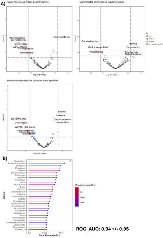After observing the beta diversity results, we found no differences, so we performed an analysis to identify which OTU abundance varied among the diseases assayed. A study was proposed to investigate the differential presence of microorganisms (Figure 3A), aiming to identify the bacteria that are more abundant within each clinical group. In our case, for IBS, the presence of the OTUs assigned to the genera Haemophilus and Corynebacterium was observed. In the case of uncomplicated diverticulitis, Parasutterella and Caldalkabacillus are mostly present. Finally, Flavobacterium is pathogenic under certain conditions in tubular adenoma. This finding highlights the distinctive ecological niches of some microorganisms under each condition.