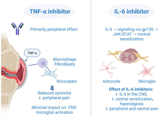 Comparative mechanisms of TNF-α and IL-6 inhibitors in central and peripheral pain modulation. Created in BioRender. Vučković, M. (2025) https://biorender.com/dxuprpb (accessed on 1 October 2025).