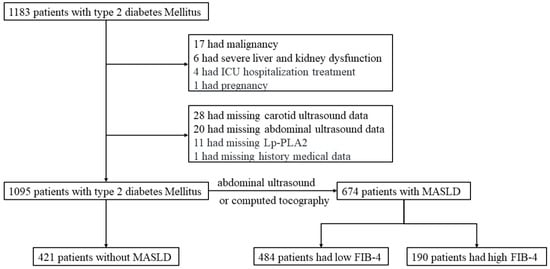 The liver, a primary organ responsible for metabolic homeostasis, also plays a crucial role in the clearance of circulating Lp-PLA2 [6,7,8,9]. Importantly, the ability of Lp-PLA2 to predict CVD in individuals with T2DM appears to be influenced by the presence of concomitant metabolic disorders, such as MASLD. However, previous studies have reported conflicting results regarding changes in Lp-PLA2 concentrations in MASLD, and it remains unclear whether Lp-PLA2 activity, which more accurately reflects its biological role, is affected by MASLD status [10,11]. Moreover, whether MASLD, especially its more advanced fibrotic stages, modifies the association between Lp-PLA2 and atherosclerosis in the high-risk T2DM population is unknown.