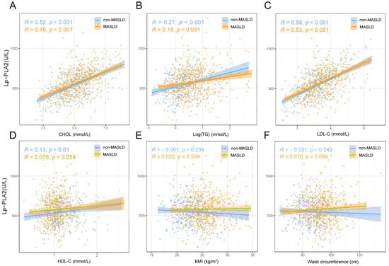 The relationship between Lp-PLA2 and lipid metabolism, body mass index, and waist circumference in metabolic-dysfunction-associated steatotic liver disease (MASLD). (A) Total cholesterol; (B) Log(triglycerides); (C) low-density lipoprotein cholesterol; (D) high-density lipoprotein cholesterol; (E) body mass index; (F) waist circumference.