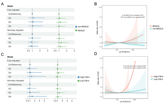 The relationship between Lp-PLA2 and carotid atherosclerosis (CAS). (A) Multivariable logistic regression model was utilized to adjust for confounding factors, including age, gender, disease duration, systolic blood pressure, smoking status, glycated hemoglobin levels, statin medication use, and diabetic kidney disease among MASLD patients and non-MASLD patients. “Minimally adjusted model” stands for adjusting age and sex. “Fully adjusted model” stands for adjusting age, sex, disease duration, systolic blood pressure, smoking, glycated hemoglobin, statin use, and diabetic nephropathy. (B) Restricted cubic spline (RCS) curves demonstrated a nonlinear relationship between Lp-PLA2 and CAS among MASLD patients and non-MASLD patients. (C) The multivariable logistic regression model was utilized to adjust for confounding factors, including age, gender, disease duration, systolic blood pressure, smoking status, glycated hemoglobin levels, statin medication use, and diabetic kidney disease, among MASLD patients with a high FIB-4 or low FIB-4 score. (D) “Minimally adjusted model” stands for adjusting age and sex. “Fully adjusted model” stands for adjusting age, sex, disease duration, systolic blood pressure, smoking, glycated hemoglobin, statin use, and diabetic nephropathy. (B) Restricted cubic spline (RCS) curves demonstrated a nonlinear relationship between Lp-PLA2 and CAS among MASLD patients with a high FIB-4 or a low FIB-4 score.