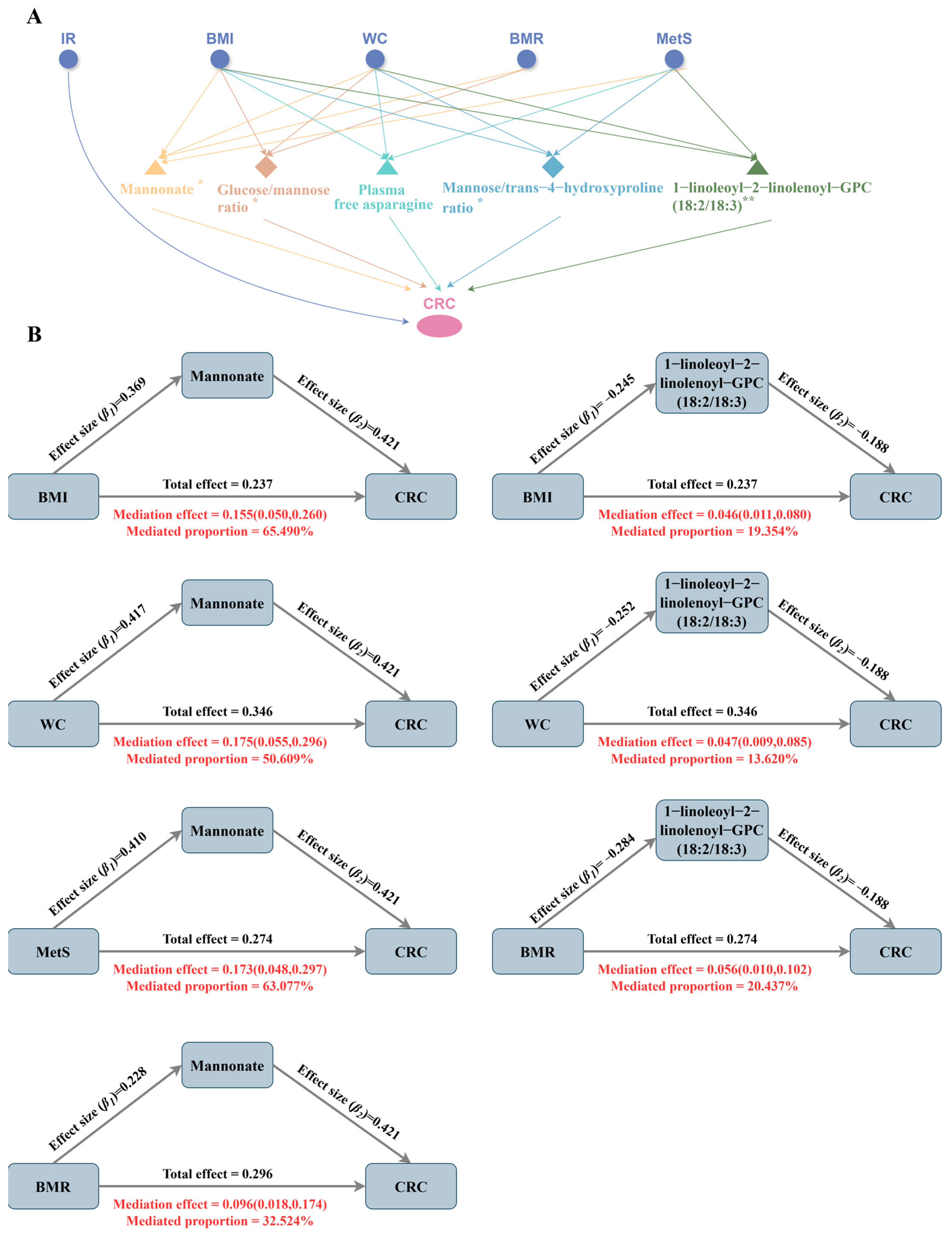 3.4. Mediating Effects of Plasma Metabolites in the Association Between Metabolic Disease-Related Phenotypes and CRC Risk