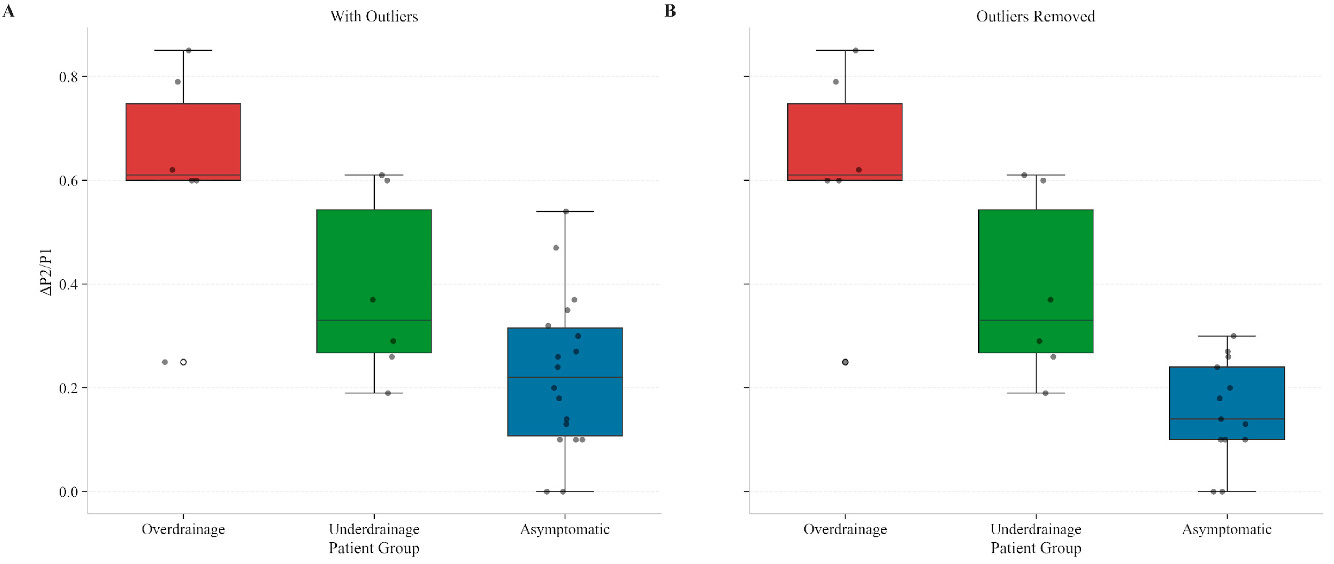 Overall, the single parameter analysis demonstrated that ΔP2/P1 may be a powerful discriminator between shunted patient conditions, with distinctly different patterns observed across all three groups. The Overdrainage group showed the highest variability (mean 0.618, SD = 0.210), Underdrainage exhibited intermediate values, and Asymptomatic patients maintained the lowest variability (mean 0.227, SD = 0.171). These statistically significant differences (p < 0.01) remained after outlier exclusion.