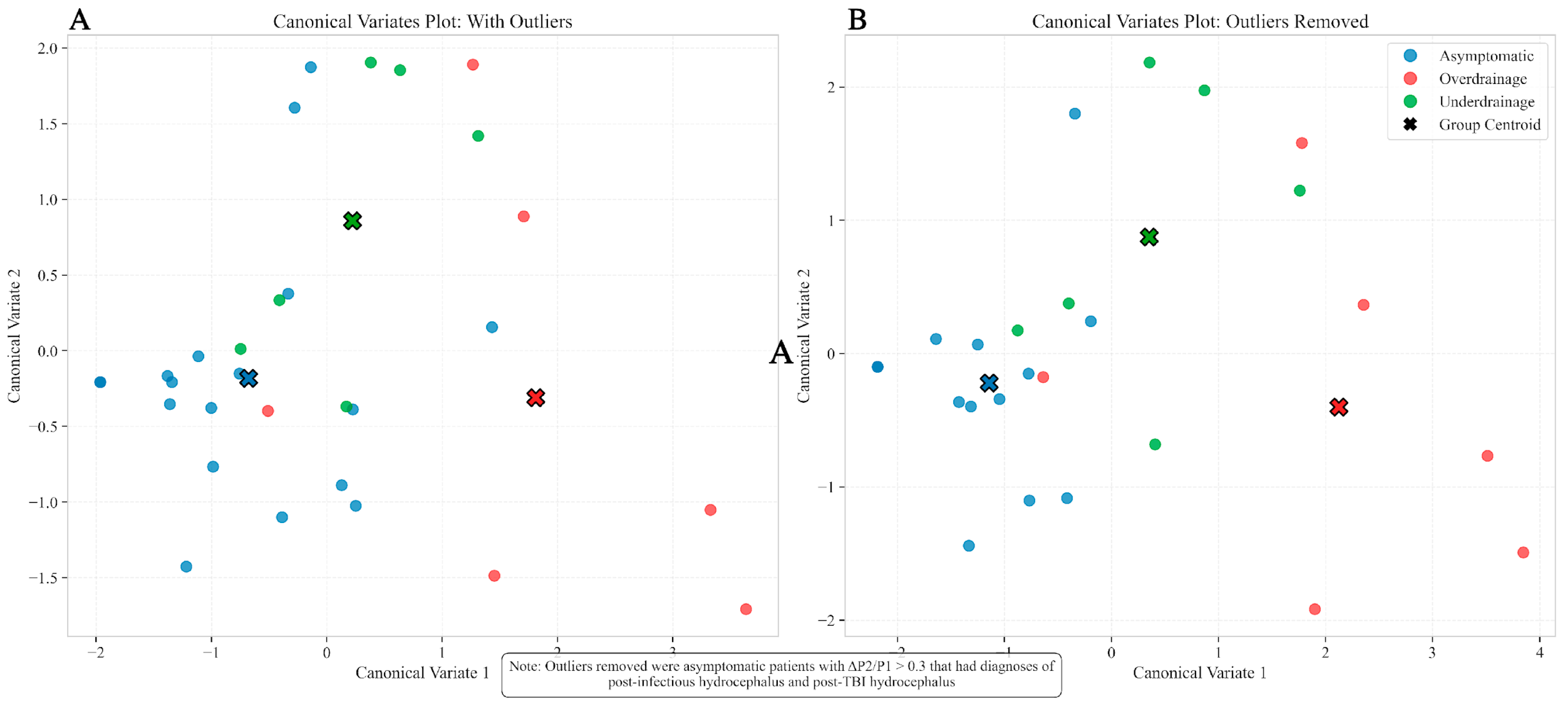 Without outliers, the canonical variates plot showed a more apparent separation between the Overdrainage group and the other two groups, with the Asymptomatic and Underdrainage groups still slightly overlapping.