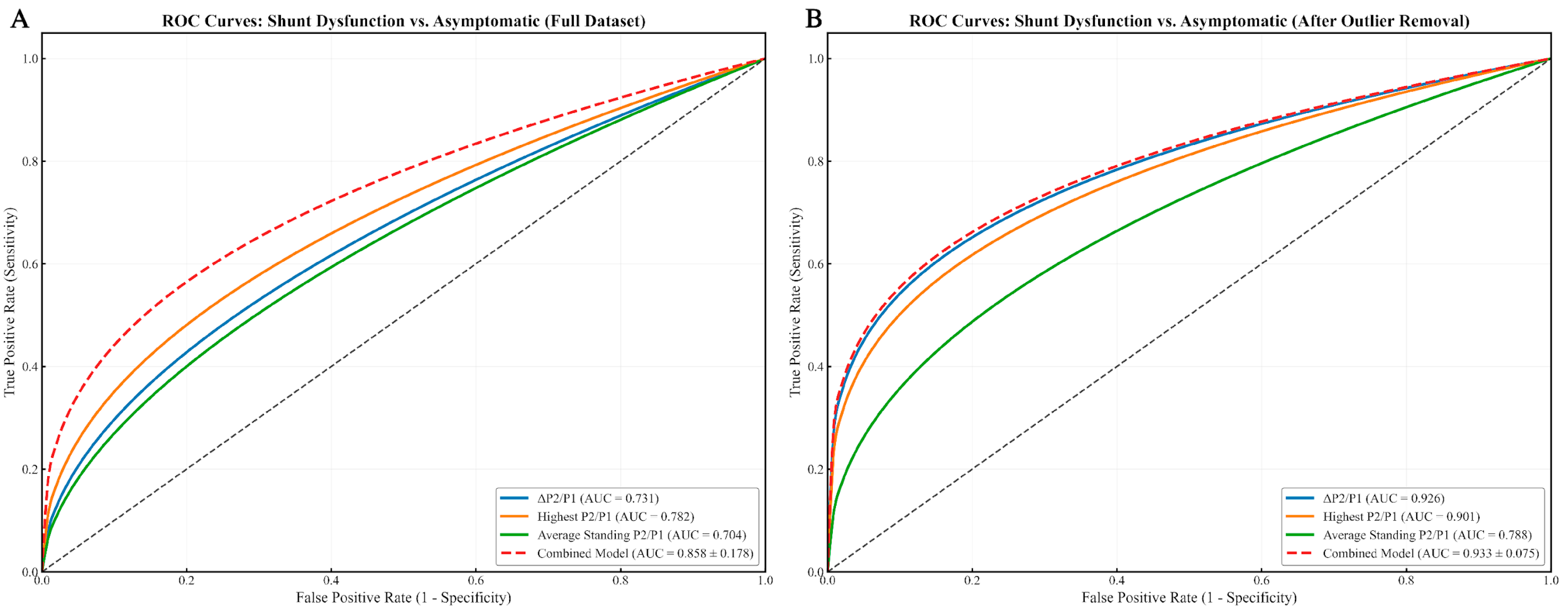 For differentiating shunt dysfunction from asymptomatic controls, the model yielded an AUC of 0.858 ± 0.178 on the full dataset, which improved to 0.933 ± 0.075 following outlier exclusion (