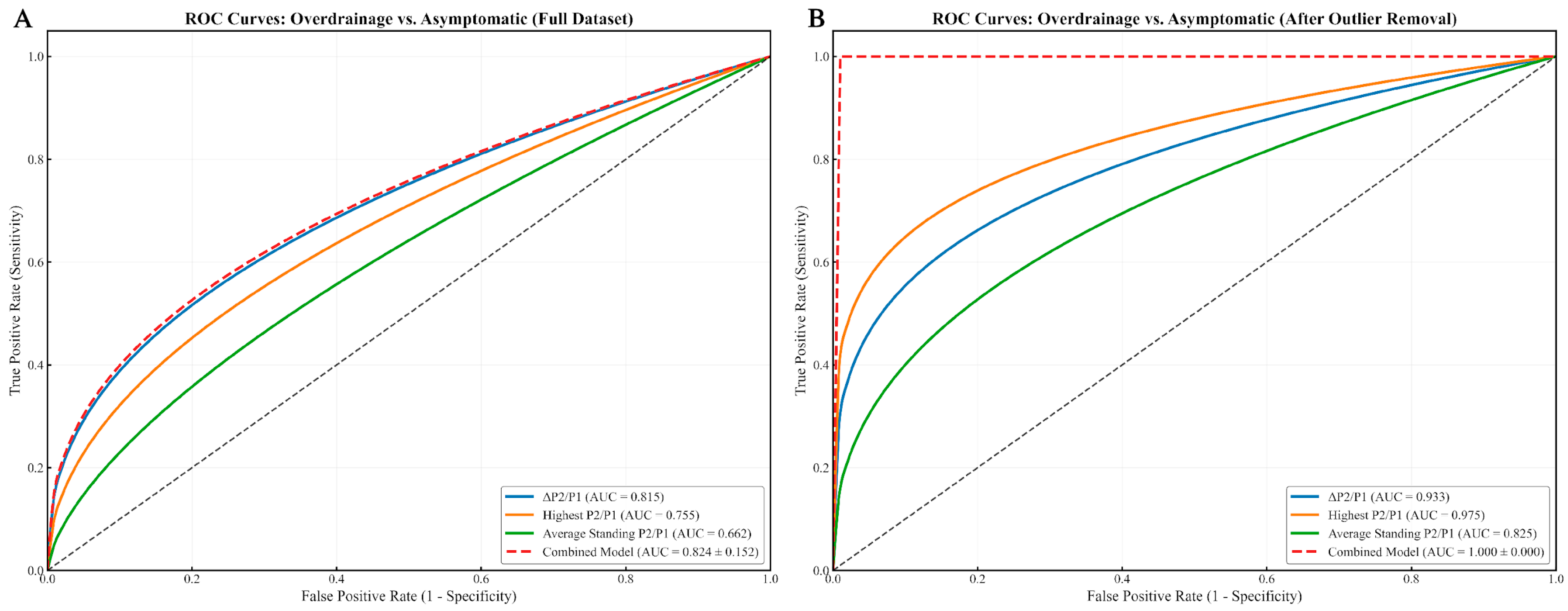 Figure 3). In subtype-specific analyses, performance appeared even higher: within the outlier-removed cohort, the model achieved an AUC of 1.000 ± 0.000 for overdrainage vs. asymptomatic (
