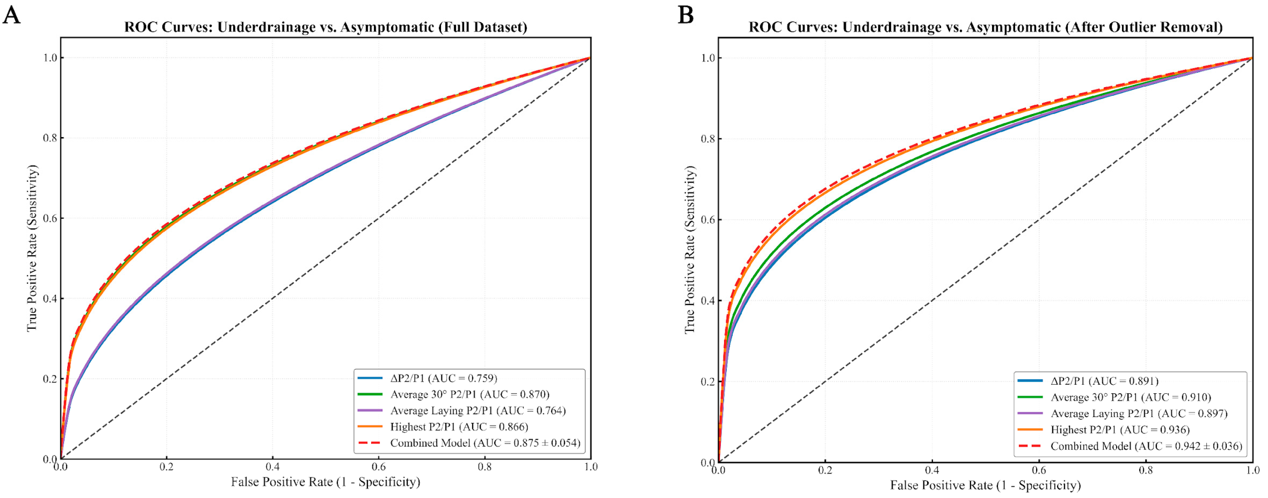 Figure 3), with an AUC of 0.731 in the full dataset, improving to 0.926 in the outlier-removed analysis. Similarly, the highest P2/P1 value yielded AUCs of 0.782 (full dataset) and 0.901 (without outliers). The average standing P2/P1 presented moderate diagnostic performance, with AUCs of 0.704 and 0.788, respectively.