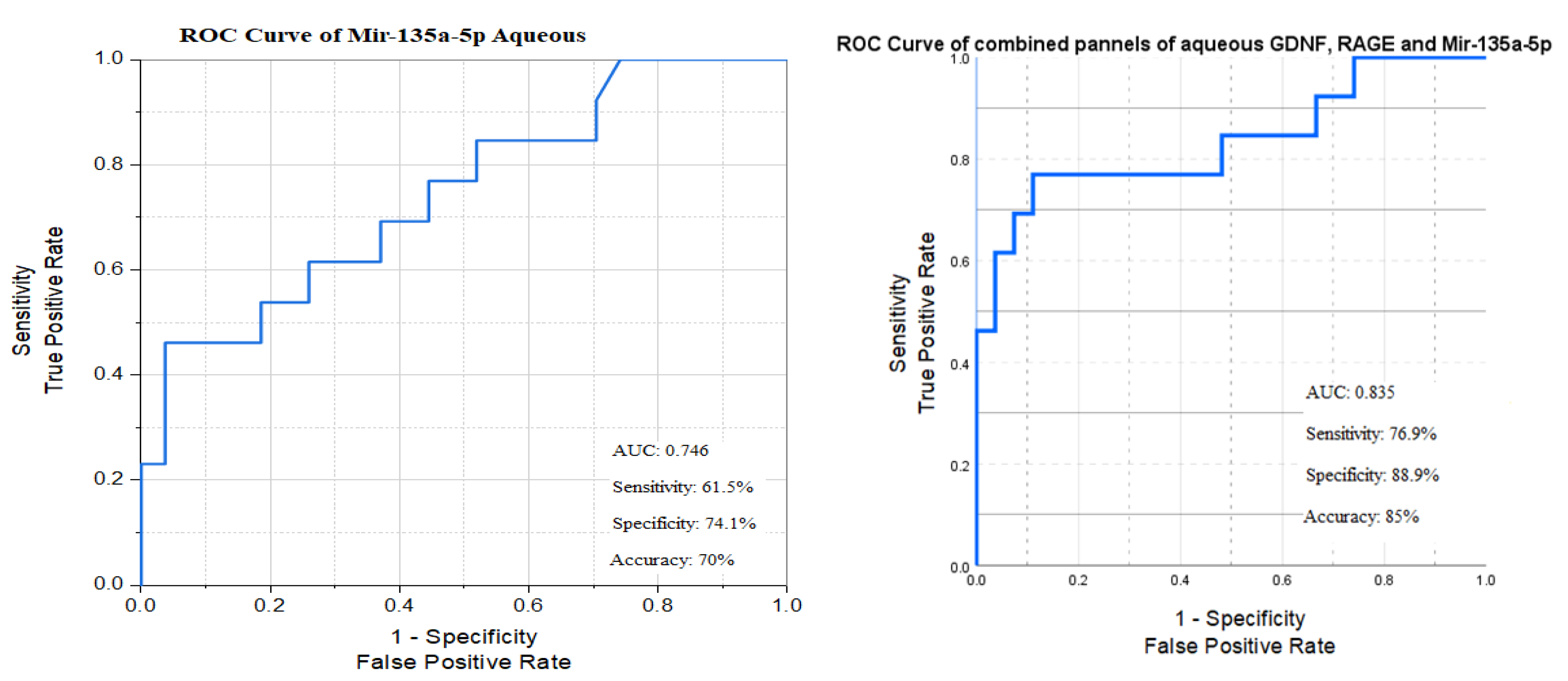 miR-135a-5p Aqueous | 0.746 | 0.012 | 7.5335 | 61.5% | 74.1% | 53.33% | 80% | 70% |