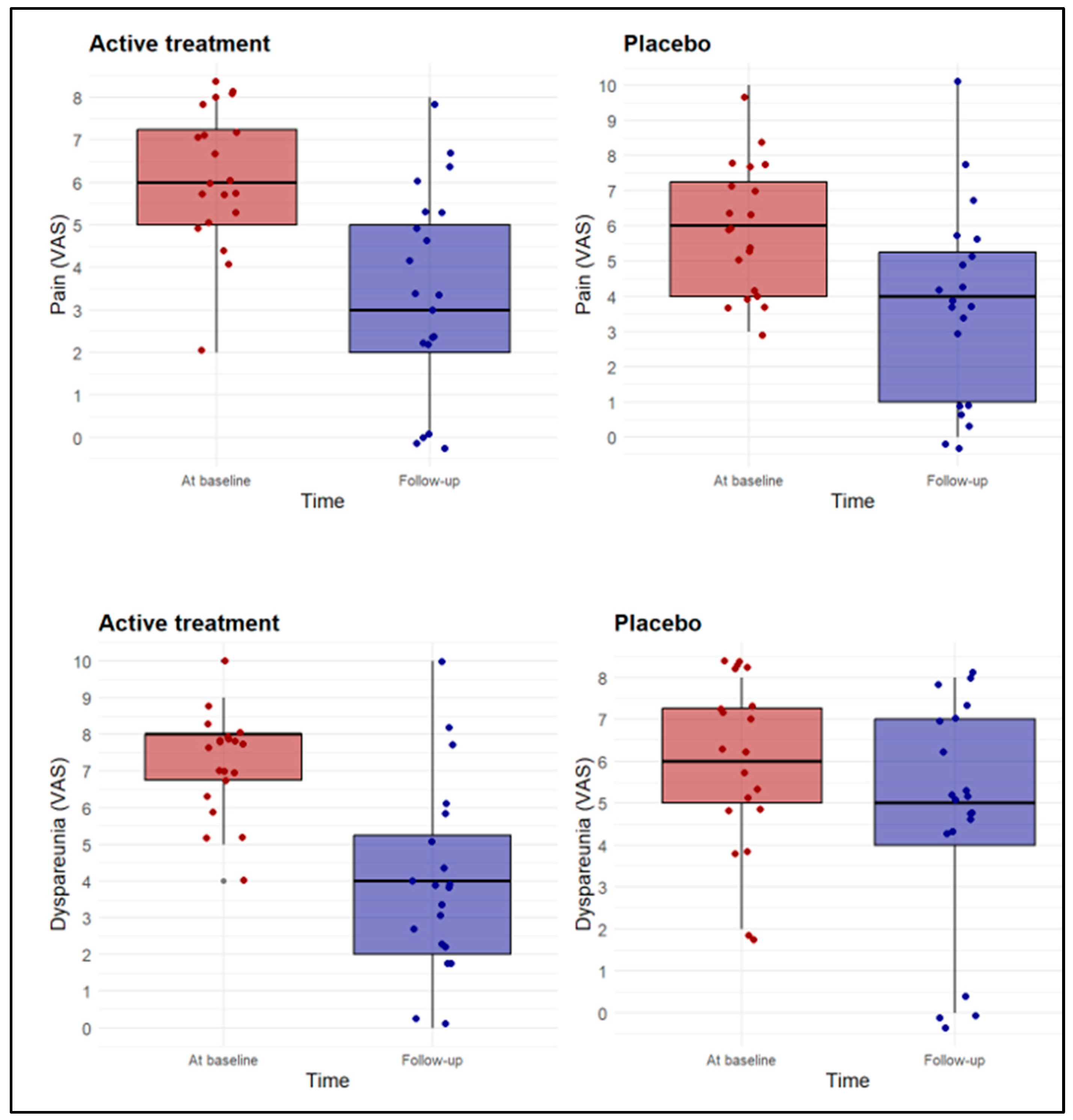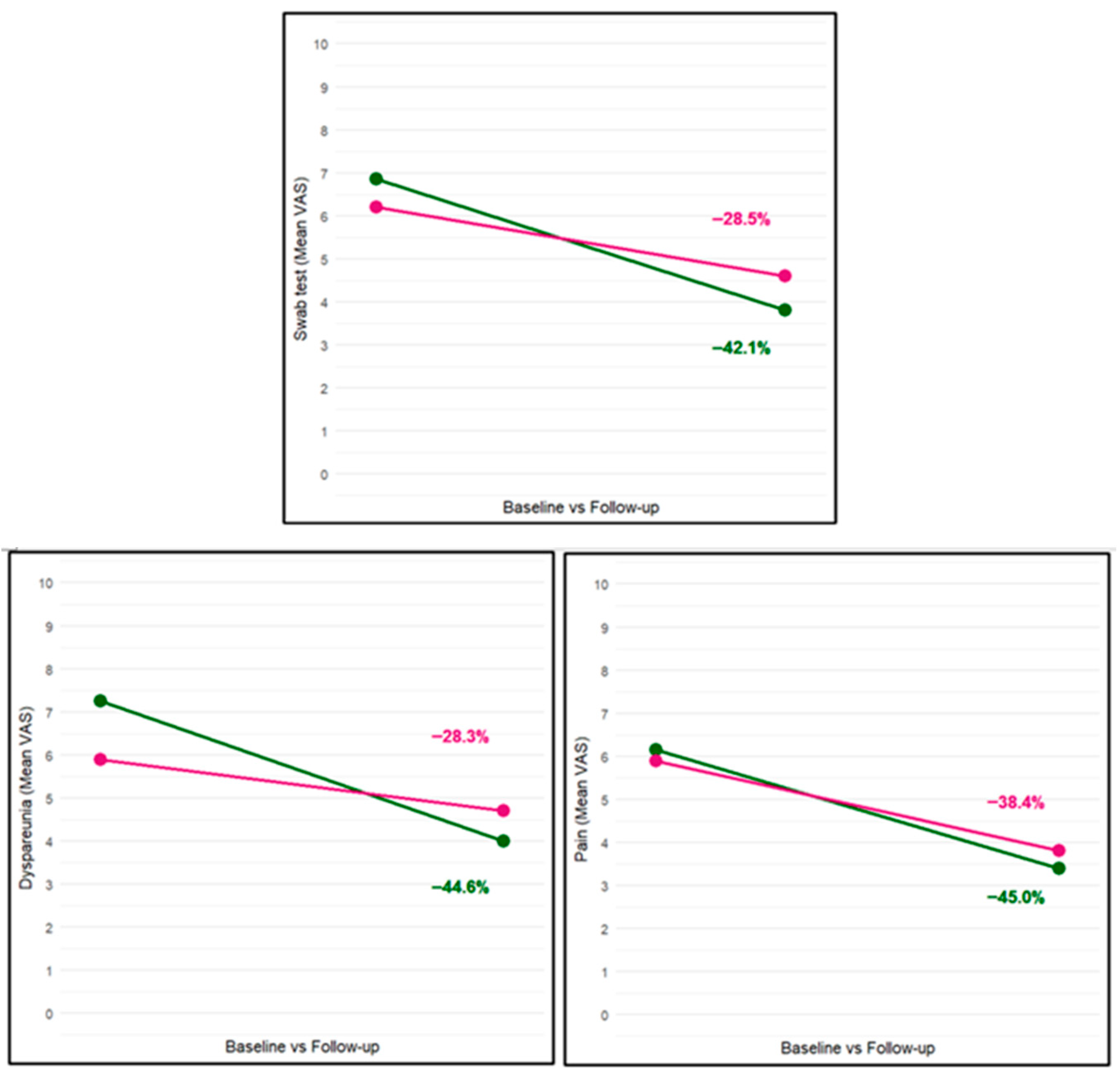 Dyspareunia (VAS) | 7.3 ± 1.4 | 4.0 ± 2.6 | <0.01 | 5.9 ± 1.9 | 4.7 ± 2.7 | <0.01 |