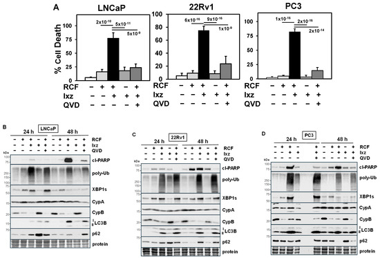 RCF + Ixz increases apoptotic cell death in PCa/CRPC cells. (A) Increased cell death in RCF (10 μM) + Ixz (2238, active form) (25 nM; 50 nM in LNCaP)-treated LNCaP, 22Rv1, and PC3 compared to RCF-, Ixz-, and control-treated cells (trypan blue assay; 72 h). QVD (10 μM; apoptosis inhibitor) decreased RCF + Ixz cell death in LNCaP, 22Rv1, and PC3. p-Values are near the bars. (B–D) Increased cl-PARP, poly-Ub, XBP1s, and LC3B in RCF + Ixz-treated (B) LNCaP, (C) 22Rv1, and (D) PC3 (24, 48 h) compared to RCF-, Ixz-, and control-treated cells (Western blot). CypB decreased with RCF and RCF + Ixz (24, 48 h), whereas there were variable effects on p62. No changes were observed in CypA. QVD decreased cl-PARP in RCF + Ixz. Molecular weight markers in kDa are shown to the left. Protein refers to loading control (Coomassie blue) after completion of analysis.