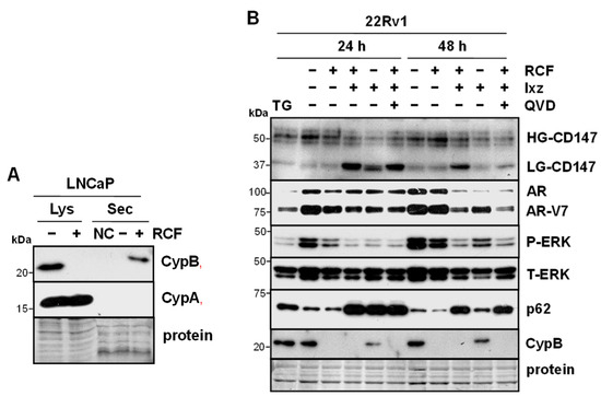 RCF increases secretion of CypB, and RCF + Ixz alters glycosylation of CD147. (A) Treatment of LNCaP with RCF (2 μM) for 24 h increased extracellular secretion (Sec) of CypB but not CypA (Western blot). Negative control (NC) was the addition of media without cells to the filter. Total lysate (Lys) is also shown, demonstrating a lack of CypB +RCF and no changes in CypA. (B) RCF (2 μM) + Ixz (9708, prodrug form) (100 nM) increased low-glycosylation (LG) CD147 (receptor for CypB) more than RCF-, Ixz-, and control-treated cells; reduction in high-glycosylation (HG) CD147 was similar in RCF + Ixz and Ixz (Western blot). Also shown are changes in AR/AR-V7, P/T-ERK (small decrease at 48 h), p62, and CypB. ER stressor thapsigargin (TG) or apoptosis inhibitor QVD had no effect on CD147. Sizes of molecular weight markers in kDa are shown to the left. Protein refers to loading control (Coomassie blue) after completion of analysis.