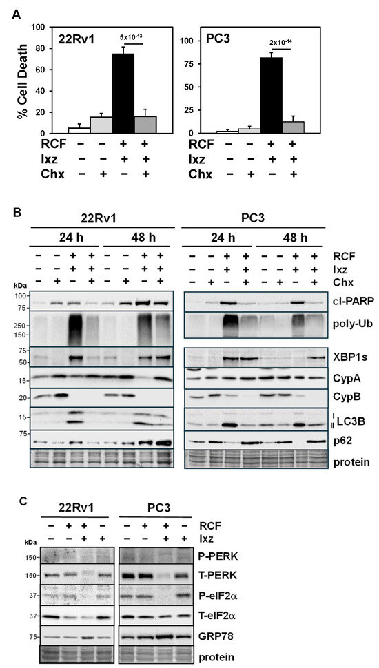Addition of cycloheximide (Chx), a protein synthesis inhibitor, to RCF + Ixz decreased cell death in 22Rv1 and PC3 (Figure 3A). Further results showed that Chx + RCF + Ixz decreased cl-PARP, poly-Ub, XBP1s (24 h), and LC3B compared to RCF + Ixz, but there were no changes in CypA or CypB (Figure 3B). In order to better survive ER stress, cells shut down protein synthesis via the PERK/eIF2α pathway (ER stress activates PERK kinase to increase P-eIF2α and block initiation of translation) [27,28]. RCF + Ixz decreased total (T)-PERK and P-eIF2α (slight decrease in T-eIF2α), suggesting this protection mechanism against ER stress was blocked (Figure 3C). Therefore, it is likely that RCF + Ixz maintenance of protein synthesis under ER stress further enhances proteotoxic stress and cell death in CRPC.