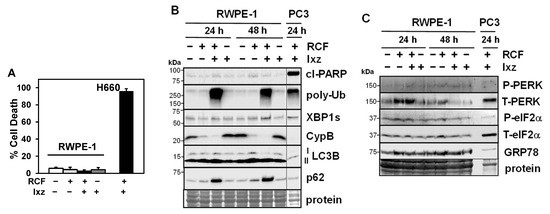 To determine the effects of RCF + Ixz on non-cancer cells, we used RWPE-1 (prostate epithelial) and BJ fibroblast cells. The results indicated RCF + Ixz induced much less cell death in RWPE-1 (3.2%) and BJ (6.0%) compared to H660 (96%) and 22Rv1 (49%) (Figure 4A) (Supplementary Materials, Figure S9A). Unlike in CRPC, RCF + Ixz did not increase cl-PARP, XBP1s, or LC3B in RWPE-1 cells, whereas in BJ cells, there was increased cl-PARP (despite low cell death) (Figure 4B) (Supplementary Materials, Figure S9B). However, non-cancer cells were not affected by RCF + Ixz’s increase in poly-Ub, suggesting they are more resistant to proteotoxic stress. In addition, the decrease in CypB caused by RCF + Ixz (and RCF alone) also occurred in RWPE-1, whereas there was no clear effect on LC3B (despite increased p62, suggesting inhibition of autophagy). In contrast to CRPC, RCF + Ixz did not decrease PERK or P-eIF2α in RWPE-1 cells (Figure 4C). Therefore, RCF + Ixz may be non-toxic in non-cancer cells due to fewer effects on cell death, apoptosis, XBP1s, and PERK/P-eIF2α.