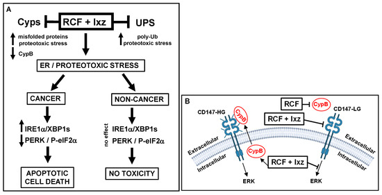 Schematic diagrams of how RCF + Ixz affects advanced CRPC/NEPC intracellular and extracellular events. (A) Intracellularly, RCF (pan-Cyp inhibitor) + Ixz (UPS inhibitor; increases poly-Ub) enhances proteotoxic stress. In cancer cells, RCF + Ixz activation of the IRE1α/XBP1s UPR pathway and maintenance of XBP1s result in cell death. In addition, RCF + Ixz decreases the PERK UPR pathway to block P-eIF2α (inhibits protein translation) and thus maintains protein synthesis to further enhance proteotoxic stress. In non-cancer cells, RCF + Ixz has no effect on XBP1s and PERK, resulting in no cell death or toxicity. RCF + Ixz decreases CypB and increases poly-Ub in both cancer and non-cancer cells. (B) RCF increases the extracellular secretion of CypB, which likely binds to the CD147-HG receptor and activates ERK signaling. RCF binds to extracellular CypB (likely decreases binding to CD147), and RCF + Ixz reduces CD147 from HG to LG, possibly reducing its function. RCF + Ixz also reduces intracellular ERK signaling. Glycosylation on the CD147 receptor is represented by small bars. LG, low glycosylation; HG, high glycosylation;
