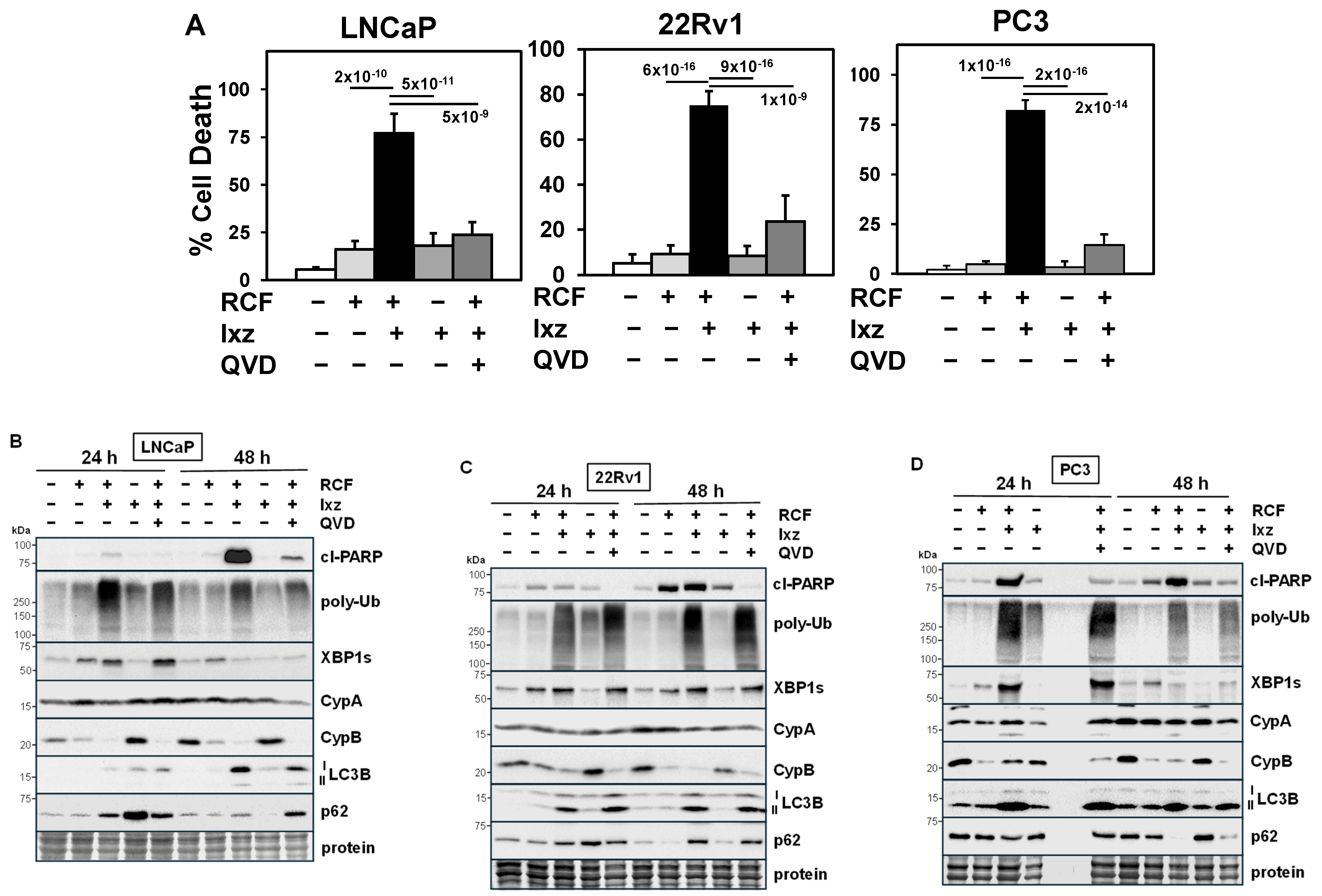 3.1. RCF + Ixz Increases Apoptotic Cell Death in PCa/CRPC/NEPC