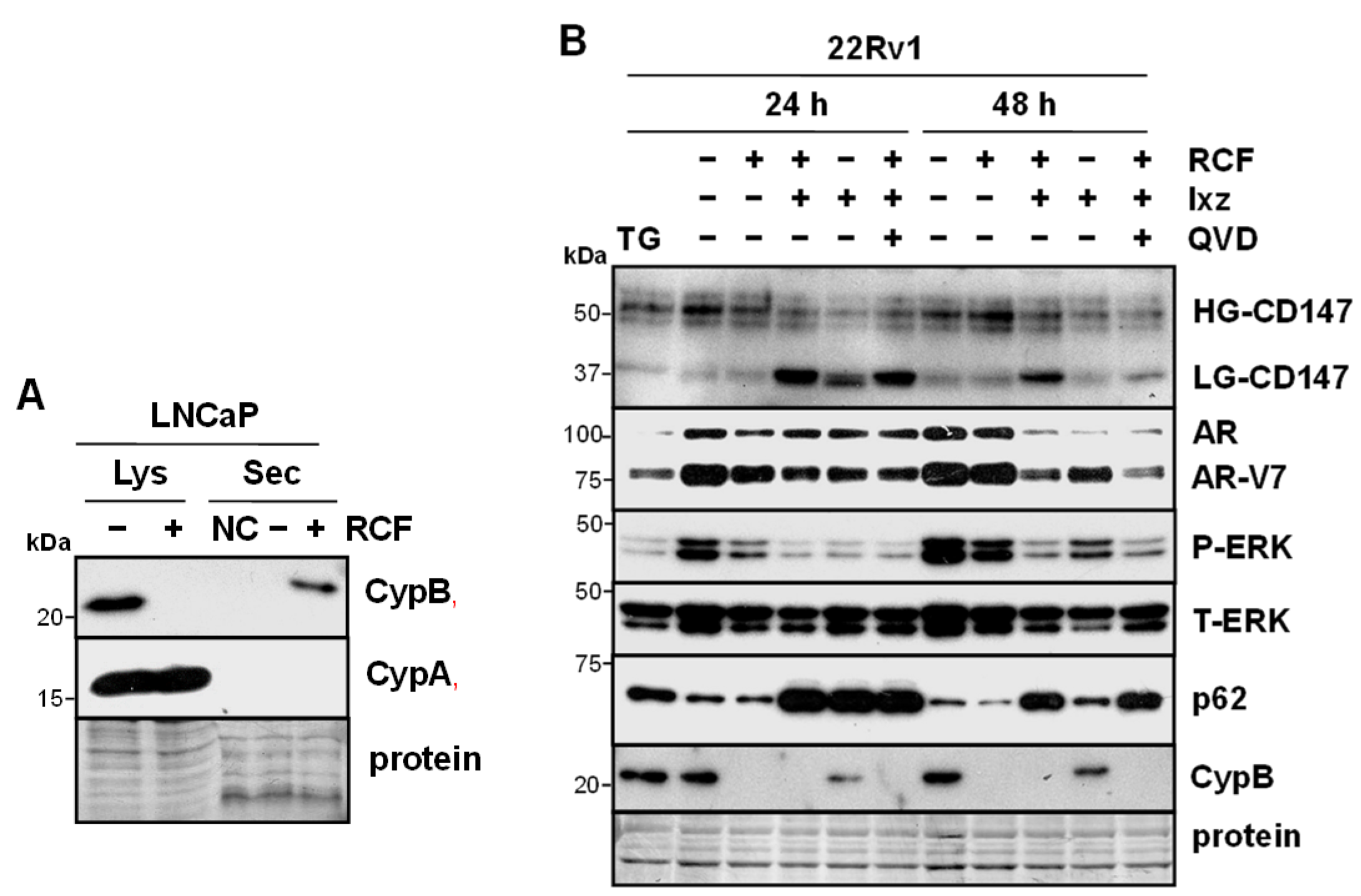 3.3. RCF Increases Extracellular Secretion of CypB and RCF + Ixz Reduces Glycosylated CD147 (Receptor for Secreted Cyp) and ERK Signaling