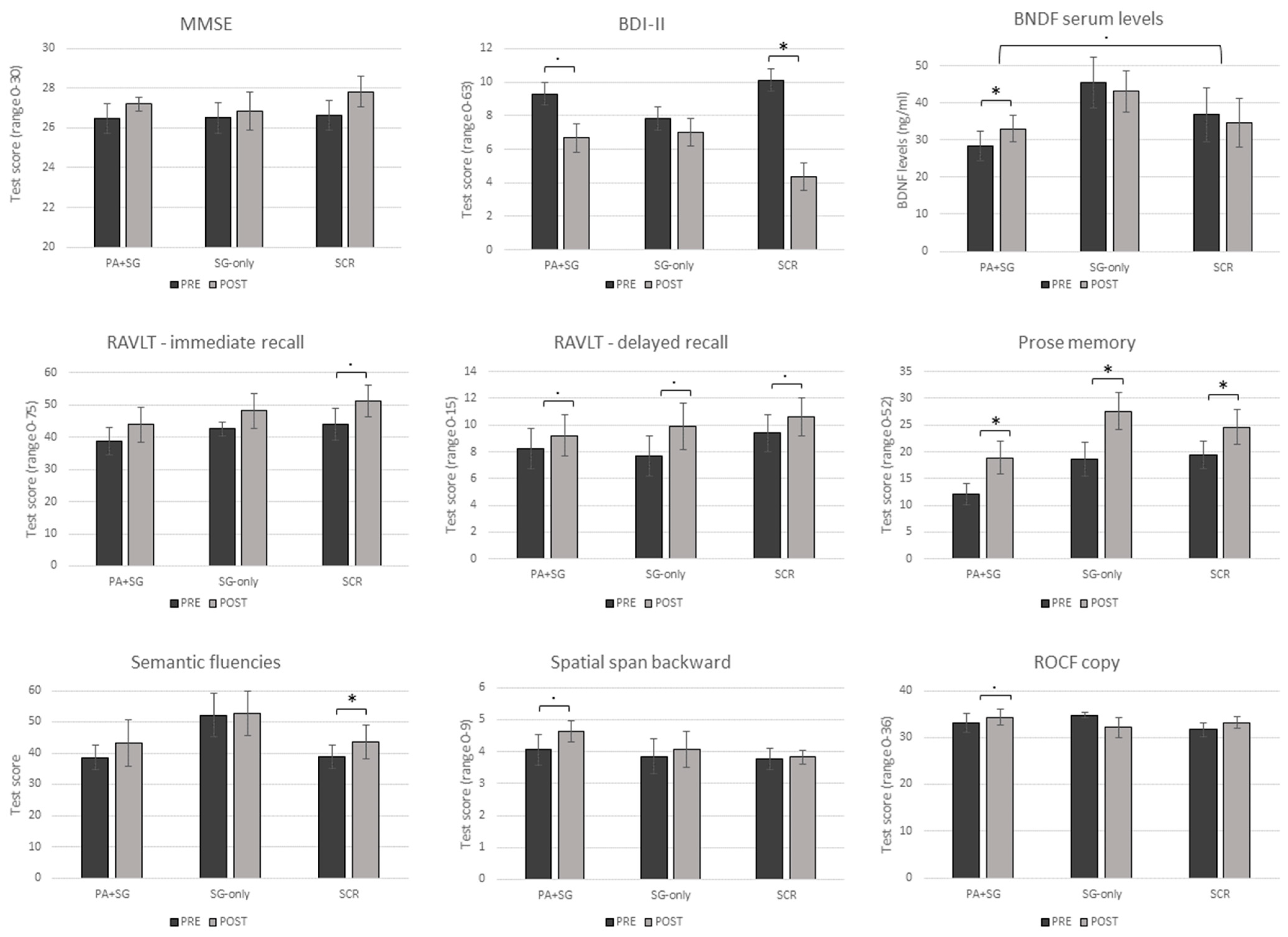 General cognitive functioning | MMSE | 26.46 (2.01) | 27.20 (0.91) | 26.50 (2.10) | 26.84 (2.56) | 26.64 (2.21) | 27.82 (2.34) |