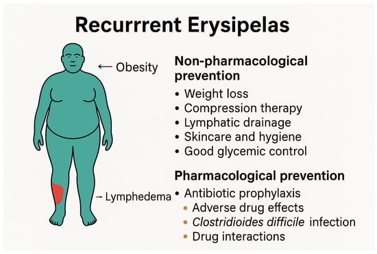 Since a single episode of erysipelas or cellulitis is frequently followed by recurrence, it is essential to address risk factors and apply preventive measures. Prevention of recurrent erysipelas can be divided into non-pharmacological strategies and pharmacological (i.e., chemoprophylaxis). Some risk factors for recurrence are modifiable through lifestyle or medical interventions, whereas others are not. Obesity is one of the most importantmodifiable risk factors. While in some cases it may result from genetic predisposition or chronic corticosteroid therapy, in most patients it is linked to sedentary behavior, caloric excess, and insufficient physical activity. Obesity itself is strongly associated with type 2 diabetes mellitus, which contributes to impaired immune function, reduced phagocytic activity, and delayed wound healing, thereby creating additional portals of entry for pathogens [7]. Lifestyle medicine—healthy diet, regular physical activity, and strict glycemic control—is therefore central to recurrence prevention. Emerging obesity medicine (obesitology) provides additional therapeutic options, including pharmacological interventions (e.g., GLP-1 receptor agonists such as semaglutide, or agents like bupropion for patients with emotional eating patterns) and bariatric surgery for eligible individuals [7,15]. Interdisciplinary care involving physicians, dietitians, physiotherapists, and psychotherapists is recommended to optimize weight loss and long-term adherence. Importantly, weight reduction not only lowers baseline risk but may also enhance the effectiveness of antibiotic prophylaxis [7]. Lymphedema is another major predictor of recurrence. Conservative management of lymphedema can reduce recurrence risk and includes manual lymphatic drainage, elevation of the affected limb, muscle-pumping exercises, use of compression garments such as multilayer compression stockings, and appropriate skin care [16]. Graduated compression stockings (GCS) are frequently prescribed; they exert the greatest pressure at the ankle with gradually decreasing compression proximally. Class 1 stockings provide <20 mmHg, Class 2 around 20–30 mmHg, and Class 3 ≥30 mmHg [7]. However, compliance with GCS can be challenging—non-adherence rates of up to 60% have been reported due to discomfort, skin irritation, or cosmetic concerns [7]. Moreover, they are contraindicated in patients with significant peripheral arterial disease, neuropathy, or material allergy. Despite these limitations, clinical studies have confirmed their benefit: in a randomized single-center trial, compression therapy reduced recurrence risk with a hazard ratio (HR) of 0.23 (95% CI 0.09–0.59, p = 0.002), provided patients adhered to wearing them most days of the week [7]. In a small single-center nonblinded trial involving patients with chronic leg edema and cellulitis, compression therapy was associated with a lower recurrence rate compared to patient education alone (15% vs. 40%) [17]. In cases related to chronic venous insufficiency, where conservative measures fail, further evaluation with intravascular ultrasound and venous stenting may be considered to improve venous outflow and reduce recurrence risk [7]. If conservative lymphedema therapy is insufficient, surgical procedures such as excision or liposuction of fibroadipose tissue or lymphovenous bypass may be considered [18]. Other anatomical abnormalities of the lymphatic system may also predispose patients to recurrence. Importantly, a previous episode of erysipelas itself remains one of the strongest predictors of future recurrence, which is a non-modifiable factor [2]. In women after mastectomy with lymph node dissection, prevention can be more complex. While lymphedema in such cases is not reversible, preventive measures include careful skin protection and avoiding blood draws or blood pressure measurements in the affected arm. Other chronic diseases also play a role.Chronic obstructive pulmonary disease (COPD) has been linked to increased erysipelas recurrence [2], highlighting the importance of smoking cessation, which additionally improves microcirculation and tissue healing [7]. Smoking cessation strategies include behavioral interventions and pharmacological support, such as nicotine replacement therapy, bupropion, or cytisine [15]. Skin integrity and hygiene are additional key factors. Poor hygiene, interdigital mycoses, or chronic eczema significantly increase the risk of recurrence by providing bacterial entry points. Regular moisturizing, treatment of abrasions or fissures, and targeted antifungal therapy (topical or systemic) for tinea pedis and onychomycosis are essential [7,19]. Preventive measures also include appropriate footwear, avoidance of barefoot walking in public places, and maintaining proper foot and leg hygiene. Prolonged immobilization in patients with venous insufficiency or lymphedema may further increase recurrence risk. These interventions, when applied consistently, have the potential to substantially reduce recurrence rates and may decrease the need for antibiotic prophylaxis. At present, no vaccines are available against erysipelas, and prior infection does not confer lasting immunity. Ultimately, non-pharmacological strategies should be regarded as the cornerstone of recurrence prevention. As discussed later in this review, antibiotic chemoprophylaxis, although effective, carries the risk of adverse effects, microbiota disruption, and antimicrobial resistance. Therefore, prioritizing lifestyle interventions, lymphedema management, and optimized control of comorbidities is essential. Obesity, in particular, not only increases the baseline risk of recurrence but also reduces the success rate of antibiotic prophylaxis, further underscoring the need for comprehensive, multidisciplinary approaches that target modifiable risk factors as a first-line strategy. Non-pharmacological strategies for prevention of recurrent erysipelas are sum