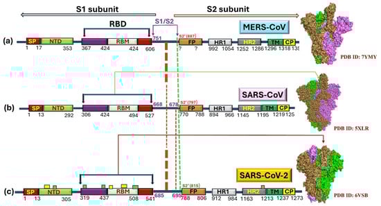 The S-protein, a pivotal structural protein of hCoVs, including SARS-CoV, drives infectivity by engaging with the ACE2 receptor via its RBD, which is embedded in the S1 subunit. The receptor-binding motif (RBM) binds to the ACE-2 receptor, facilitating viral penetration [43]. The S-protein comprises S1 and S2 subunits and modifies itself by undergoing cleavage. A schematic representation of the S-protein of MERS-CoV, SARS-CoV, and SARS-CoV-2 was created using PyMOL for visualizing the protein structures (Figure 2). The spike protein conformations were depicted based on 3D density maps from the PDB structures (7YMJ, 5XLR, and 6VSB). The protein domains and receptor-binding domain (RBD), including the receptor-binding motif (RBM) and fusion peptide (FP), were highlighted to show the structural differences between the variants. Figure 2 illustrates the comparative aspects of the S-protein of hCovs (MERS-CoV and SARS-CoV/CoV-2). The S1/S2 junction is the site where cleavage occurs. This junction is recognized as the cleavage site in the coronavirus of mammalian or avian origin, as illustrated in Figure 2b [44]. A highly divergent S1 subunit possessing RBD where receptor-binding motif (RBM) remains embedded and a comparatively more conserved S2 domain, each made up of two heptad repeats (HR) domains, as depicted in Figure 2b [45]. It was observed from various detailed studies that, during an outbreak of the SARS infection, distinguishable positive selection was noted for gene S of SARS, prominently during the initial and mid-phase of the outbreak [38,39,40]. Only a small proportion of sites within the S-protein exhibited strong positive selection during the 2002–2003 SARS epidemic for the phases mentioned above. Conversely, positive selection was noticed for the isolates from the late phase, indicating that the S-protein attains stability again after the early and middle stages of evolution. Reports suggested that SARS-CoVs emerged initially in bats, which later spilled over into civets. The two SARS outbreaks that occurred recently, with a gap of one year in between, were not due to animal-to-human transmission [27,38]. Most of the divergence was observed in the S-gene of SARS of two species (bats and civets), indicating the probability of a close association between SARS-CoVs in bats or of another unidentified animal [46].