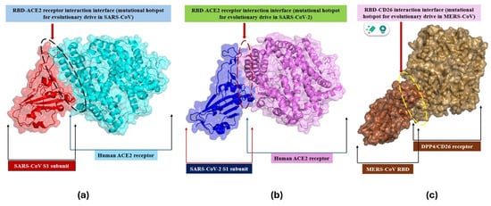 The most significant mutational site in SARS-CoV/CoV-2 is the spike’s RBD, as illustrated in Figure 3a,b [99,100]. However, the MERS-CoV’s RBD interacts with another type of cellular Receptor (CD26/DPP4), as depicted in Figure 3c [101]. Therefore, the mutational burden in the RBD may alter (strengthen) the binding potential of the RBD with cellular receptors, leading to the generation of highly infectious variants [102,103]. Events of specific single-nucleotide polymorphisms (SNPs)/mutations favor the process of natural selection in which infectivity-enhancing SNPs outperform infectivity-diminishing SNPs [1]. Thus, occasionally, such SNPs/mutations foster the ability to diminish the vaccine efficacy, evasion ability, and greater transmissibility to the evolving variants [104]. One of the most dominant global variants evolved just because of a single SNP (D614G) with enhanced infectivity, highlighting the significance of even a single SNP in the hot spot in the evolutionary process [1].