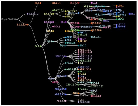 Relation between the Pango lineages on COVID-19 Data Trackers. Each node represents a SARS-CoV-2 lineage/sub-lineage descending from its previous lineage. The image is a modified version of the image retrieved from the CDC COVID Data Tracker [109], URL: https://www.cdc.gov/covid/php/variants/variants-and-genomic-surveillance.html (accessed on 12 June 2025).