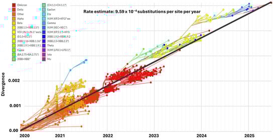 Temporal evolutionary divergence of SARS-CoV-2 variants from 2020 to 2025. The plot illustrates the progressive accumulation of mutations in SARS-CoV-2 genomes, expressed as divergence relative to the ancestral strain, across time. Distinct color-coded clusters represent major variants, including Alpha, Beta, Delta, and Omicron, along with their subsequent sub-lineages, variants of interest (VOIs), and variants under monitoring (VUMs). The black regression line indicates the estimated substitution rate of 9.59 × 10−4 substitutions per site per year. The figure highlights the accelerated diversification observed after the emergence of Omicron in late 2021, which gave rise to multiple sub-lineages that dominate the viral landscape into 2025 (https://gisaid.org/phylodynamics/angola/, accessed on 24 September 2025). Asterisk (*) denotes descendant sublineages.