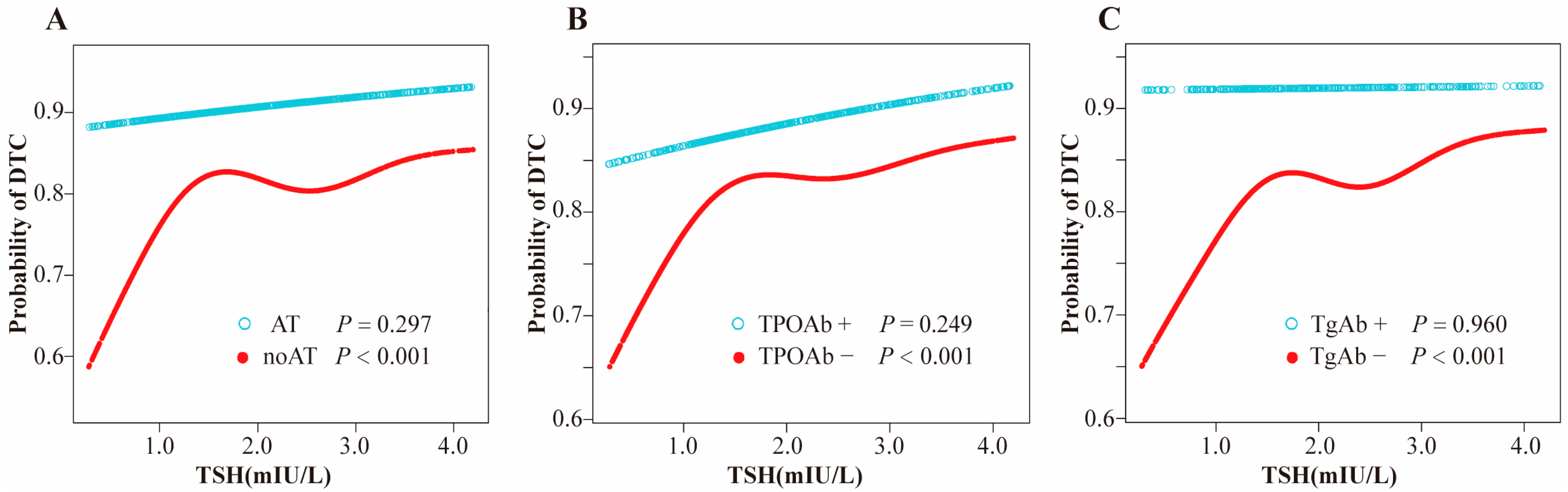 Chicago/Turabian StyleYu, Lu, Hanyu Wang, Xiao Chen, Yuhan Zhang, Jiaqi Liu, Yang Chen, Yuxin Yu, Siqi Wang, Yu Wang, Zixuan Wang, and et al. 2025. "Differential Association of Serum TSH with Differentiated Thyroid Cancer Risk by Autoimmune Thyroiditis Status" Biomedicines 13, no. 10: 2451. https://doi.org/10.3390/biomedicines13102451