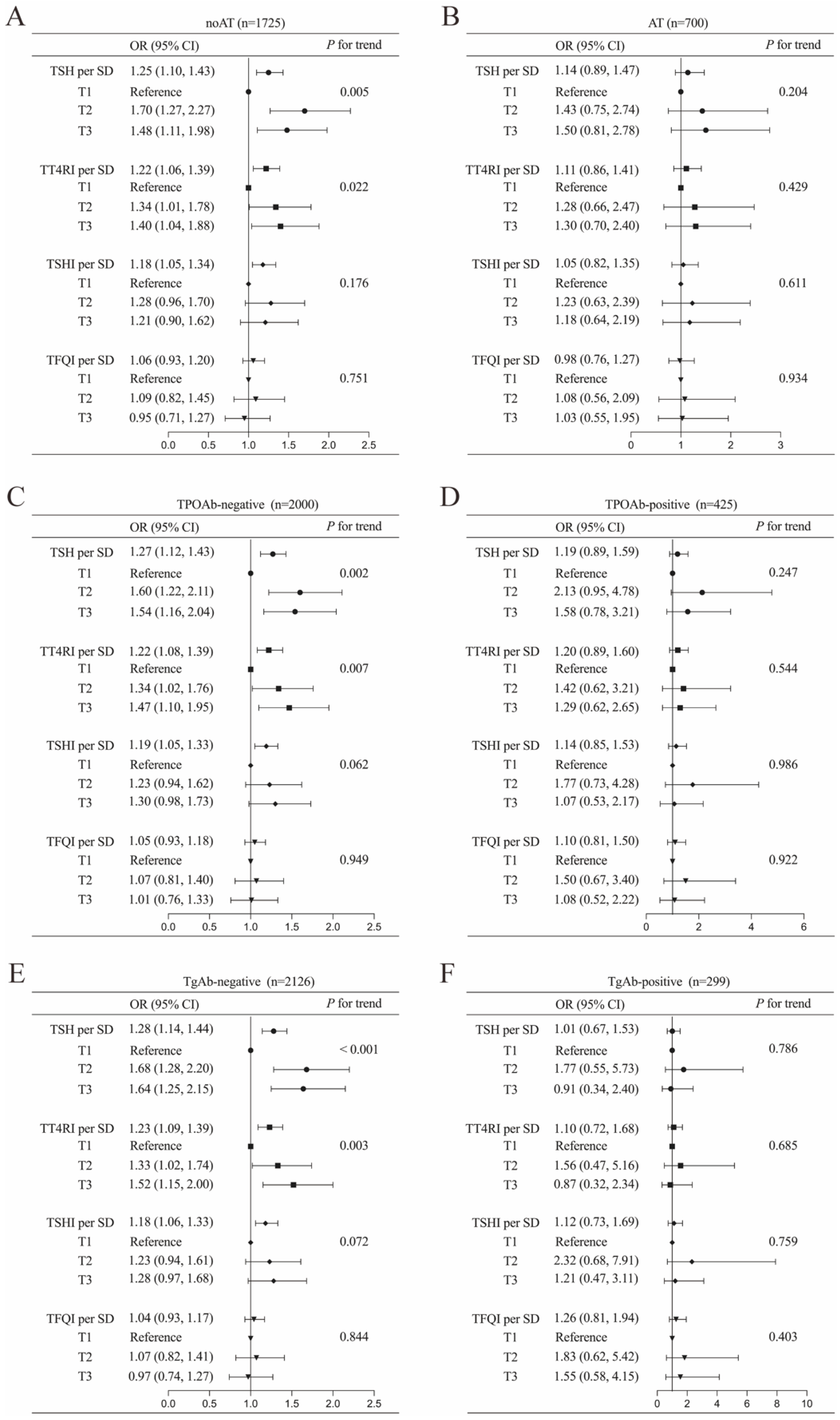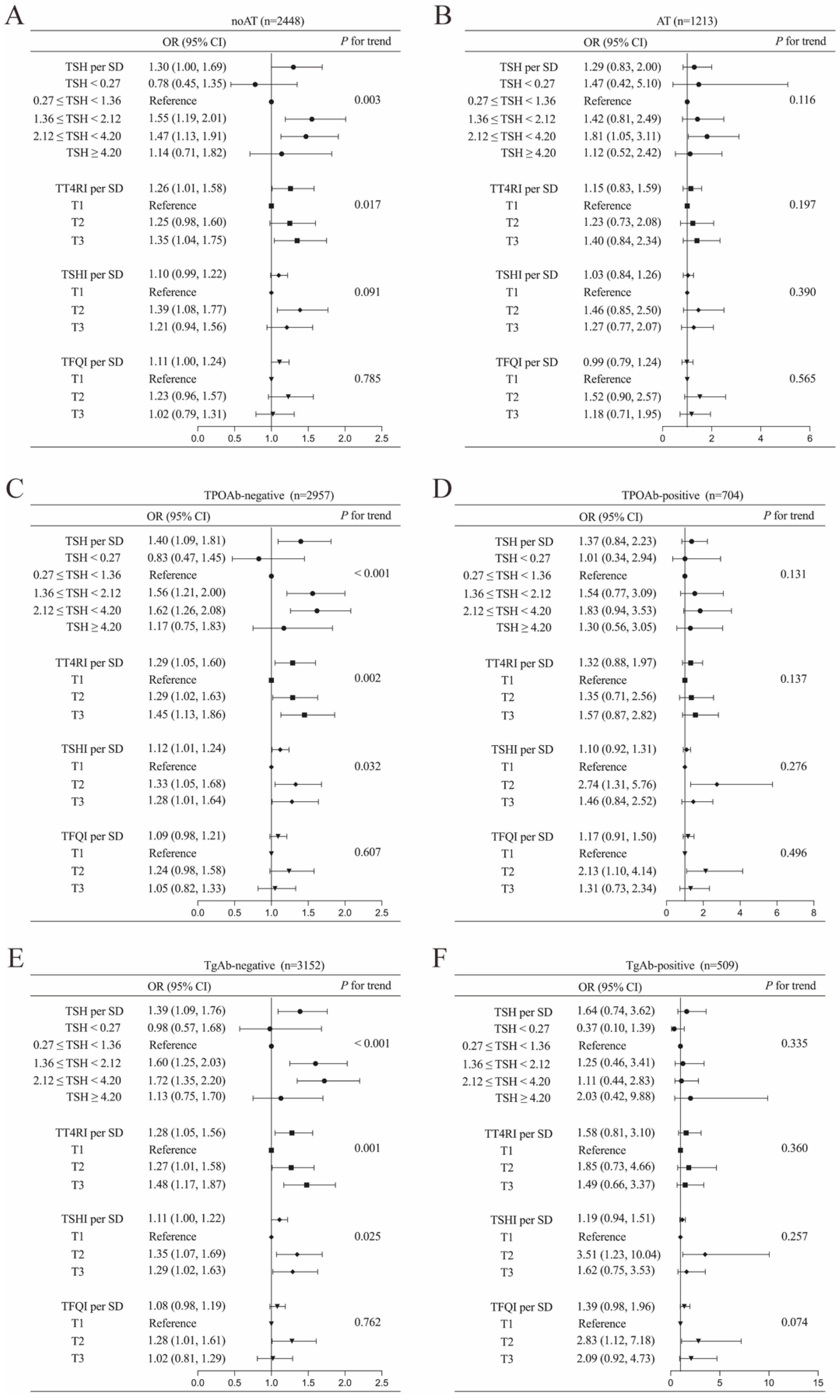 | TSH (mIU/L) | 1.71 (1.20, 2.39) | 1.74 (1.25, 2.42) | 1.52 (1.03, 2.23) | <0.001 |
