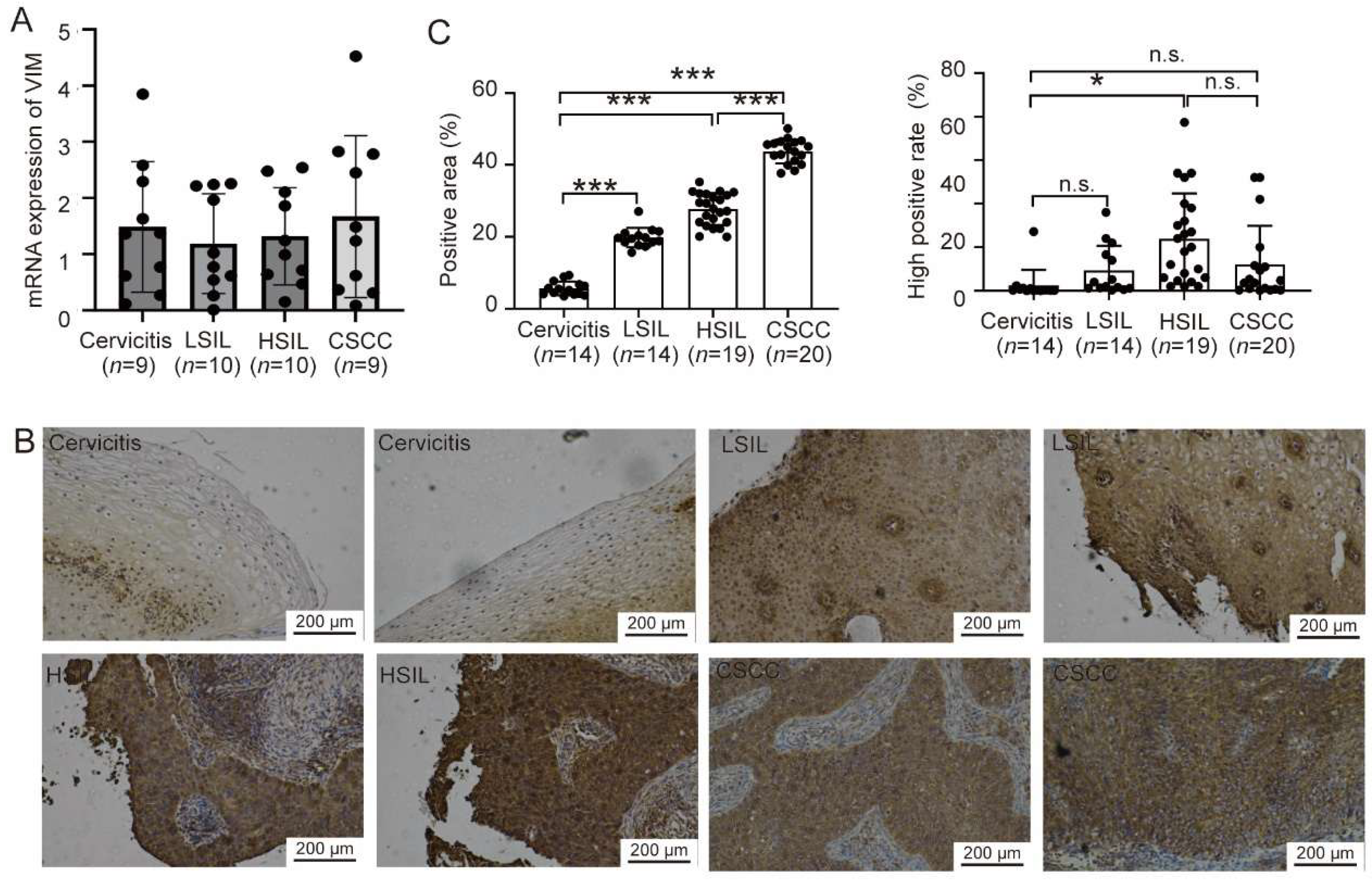 14]. In our experiment, through immunohistochemical analysis of collected typical clinical samples, we observed that VIM expression levels gradually increased and exhibited a significant trend during the process of cervical intraepithelial neoplasia. This finding also suggests that the elevation of VIM may serve as a potential indicator for cervical cancer.