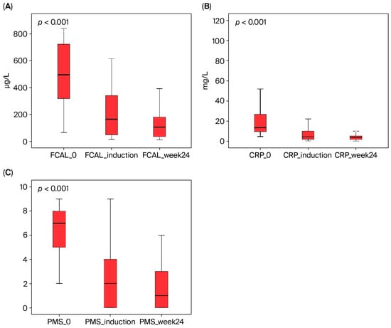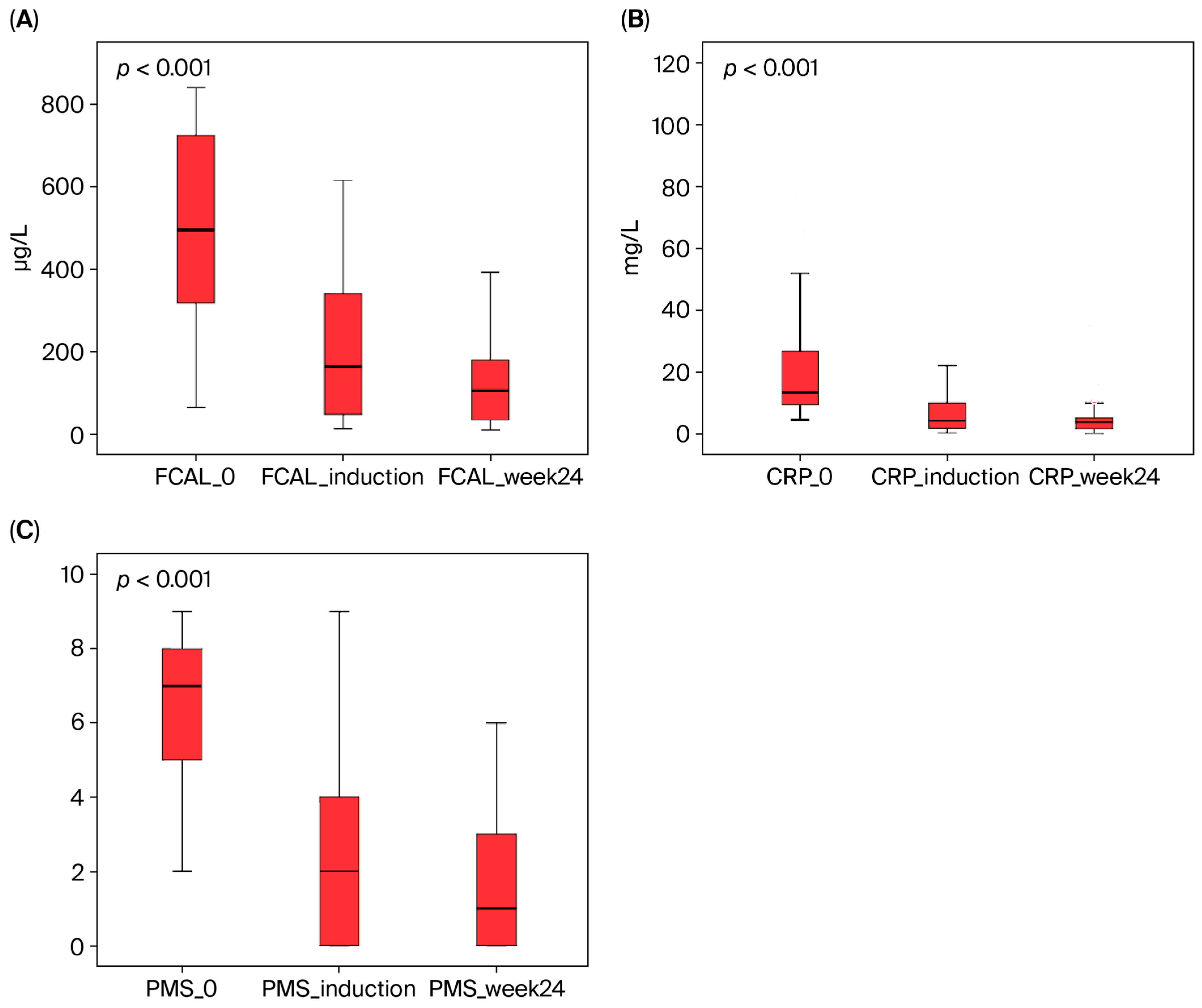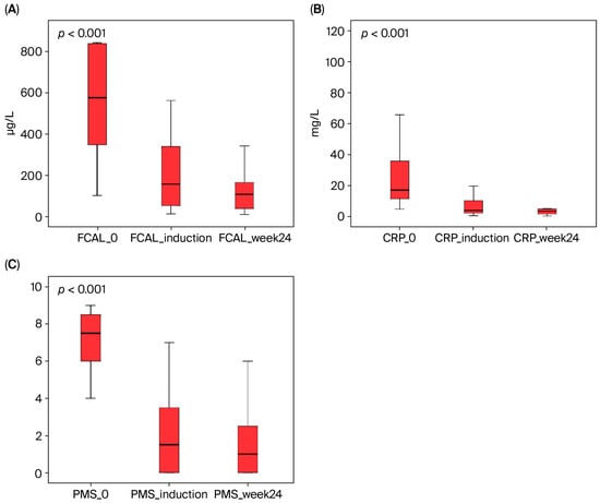 For patients who discontinued treatment due to a loss of response or other reasons during the induction or maintenance phase, FCAL, CRP, and all other laboratory values were recorded at the time of discontinuation. These data were included in the analysis for the relevant evaluation period (induction or week 24).