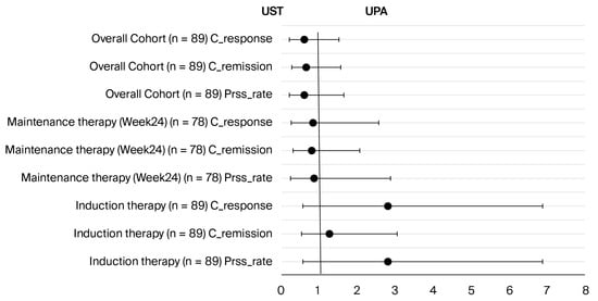 The statistical analyses were performed using SPSS (Statistical Package for the Social Sciences) version 25.0 (IBM Corp., Armonk, NY, USA), and a p value of <0.05 was considered statistically significant. Demographic and laboratory data were summarized as the mean ± standard deviation (SD). The Shapiro–Wilk test was used to determine whether the data had a normal distribution. The Independent Samples t-test for normally distributed data and the Mann–Whitney U test for non-normally distributed data were utilized to compare continuous variables between the two independent groups (UST and UPA). Categorical variables were presented as frequency and percentage (%). The chi-square test and, where appropriate, Fisher’s Exact Test were applied to compare proportions between groups. To compare measurements at different time points for the same patient (baseline, induction, and week 24), Repeated Measures ANOVA was used for normally distributed data, and the Friedman test or Wilcoxon signed-rank test was used for non-normally distributed data. Using a mixed-model approach within the Generalized Linear Model, considering the Time × Treatment Interaction, the difference in efficacy between the treatment groups was assessed. This approach allowed for the inclusion of missing data from patients who were lost to follow-up, thereby minimizing bias. The effect size was reported with the odds ratio (OR) and its 95% confidence interval (CI).