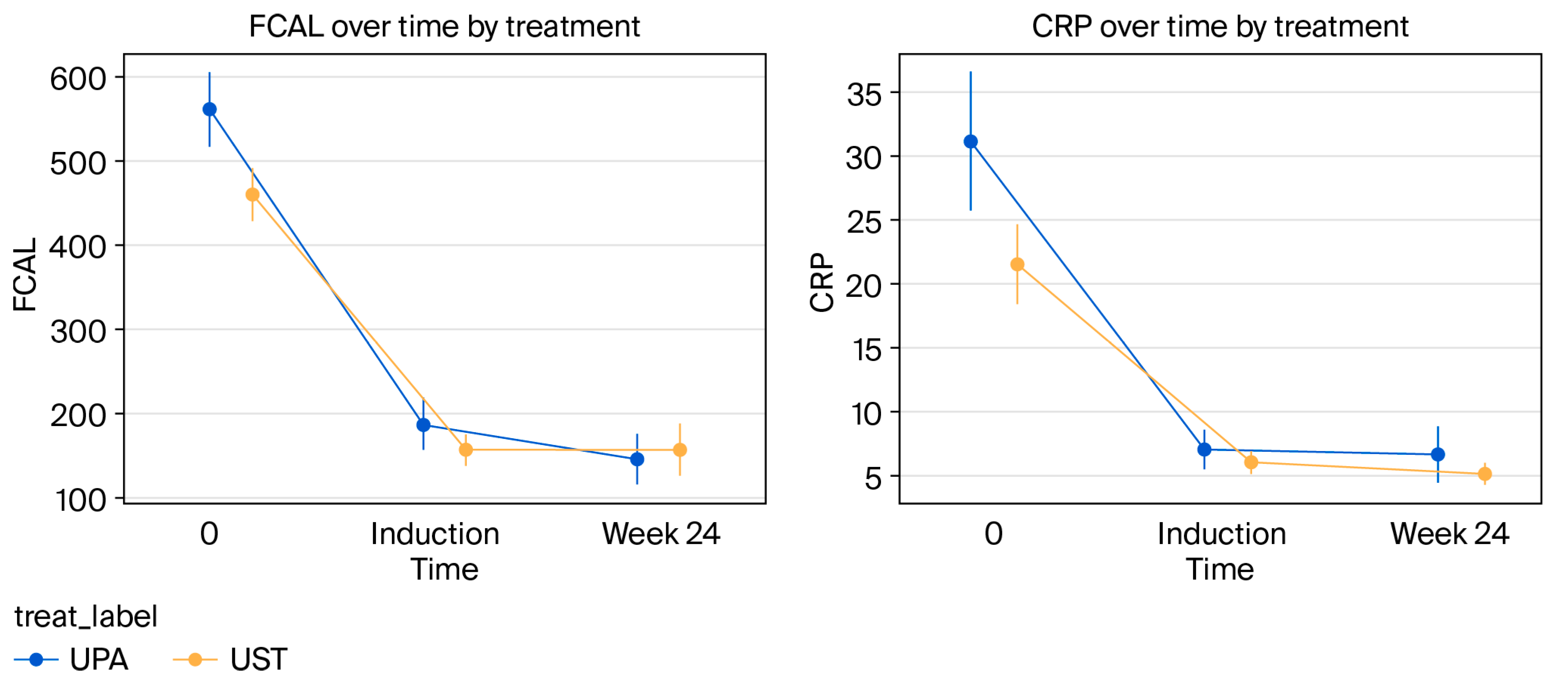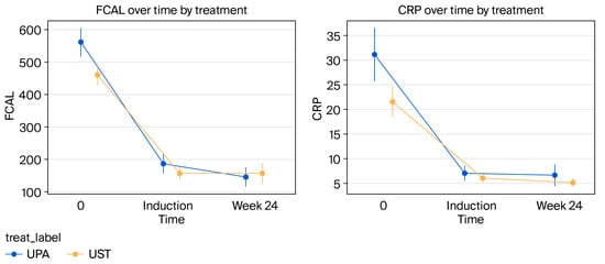 In both treatment groups, fecal calprotectin (FCAL) and C-reactive protein (CRP) values showed a statistically significant decrease from baseline to week 24. Analyses comparing the changes between the groups revealed that the UPA group showed a more effective reduction in FCAL and CRP values than the UST group (