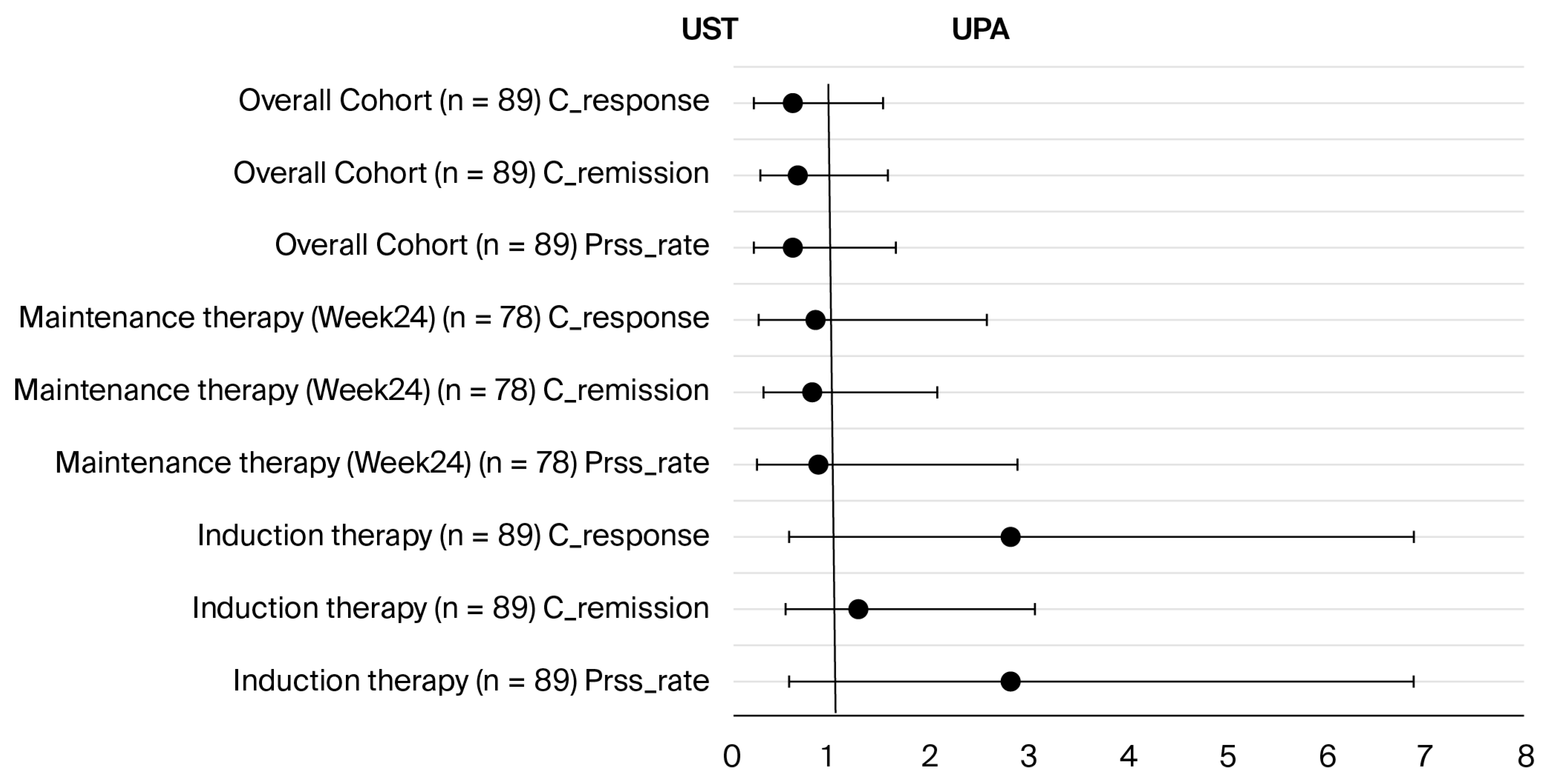 In our study, the rates of clinical response, remission, and persistence were compared between patients receiving UST and those receiving UPA during the induction and maintenance (week 24) periods. As shown in