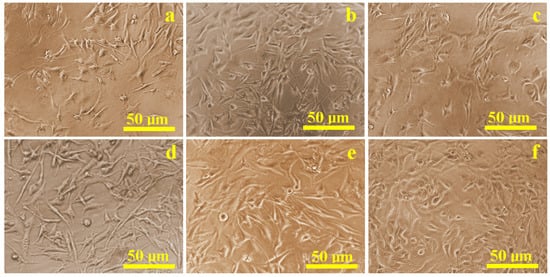 The proliferation of mesenchymal stem cells (MSCs) cultured in flat-bottom wells with conditioned media from the different treated implants was evaluated using biological optical microscopy (Figure 1). Most samples, except those treated with hydrogen peroxide, exhibited predominantly healthy cells with rounded nuclei measuring 10–15 µm, and well-developed cytoplasmic projections between 15 and 20 µm. Cell density on all surfaces was comparable to the control sample (Figure 1a), except for the hydrogen peroxide group (Figure 1c). Several cells showed compromised morphology, including disrupted membranes and displaced nuclei, consistent with cell death, in addition to reduced overall density.