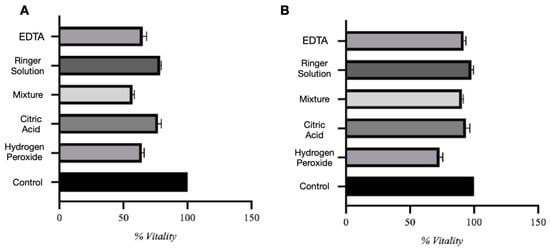 In the indirect assay (Figure 3B), using conditioned media, the control group maintained 100% viability. Conditioned media from Ringer solution, citric acid, citric and phosphoric acid, and EDTA all preserved high MSC viability (90–99%), indicating minimal release of toxic substances. In contrast, media conditioned with hydrogen peroxide reduced viability to approximately 73%, suggesting the release of cytotoxic compounds. Statistical analysis confirmed significant differences among groups (F = 74.92, p < 0.0001, R2 = 0.9690), and the Brown–Forsythe test again showed no significant differences in variance (p = 0.5754).