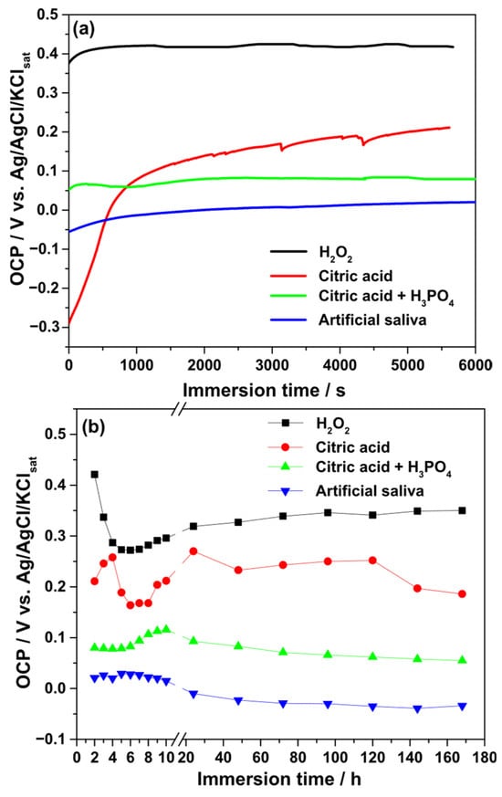 In artificial saliva, the OCP increased from −0.055 V to +0.22 V during the first 10 h, after which a gradual decrease toward −0.03 V was recorded. Overall, the relative stability of the passive film, as suggested by OCP measurements, decreased in the following order: H2O2 > citric acid > citric–phosphoric acid mixture > artificial saliva.