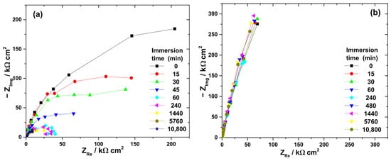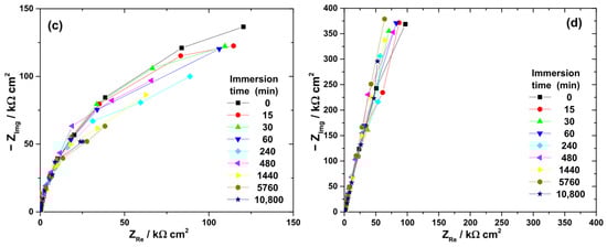 The EIS measurements were performed over a period of 168 h of continuous immersion. EIS spectra were recorded every 15 min during the initial 8 h of immersion in the solutions and subsequently every 24 h. EIS measurements were obtained in the frequency range of 10 kHz–10 mHz with five points per Hz decade, using a 10 mV sinusoidal perturbation around the OCP.