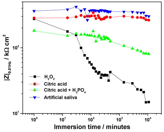 Significant electrolyte-dependent changes were observed during prolonged immersion. In the 3% H2O2 solution, the |Z|0.01Hz value decreased sharply to 99.7 kΩ·cm2 within the first 45 min and continued to decline, reaching 14.9 kΩ·cm2 after 168 h. For the citric–phosphoric acid mixture, |Z|0.01Hz showed a monotonic decrease throughout the exposure period, attaining 80.6 kΩ·cm2 by the end of the experiment. In contrast, immersion in 40% citric acid resulted in relatively stable |Z|0.01Hz values over 168 h, suggesting persistence of the protective film. Among all tested electrolytes, artificial saliva yielded the highest and most stable |Z|0.01Hz values, even during prolonged immersion, indicating superior passive film stability.