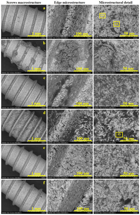SEM images of the investigated Ti6Al4V screws at macrostructural level with details on the screw edge and grains microstructure: (a) control sample, (b) Ringer’s solution, (c) hydrogen peroxide, (d) citric acid, (e) artificial saliva, and (f) mixture of citric and phosphoric acids.