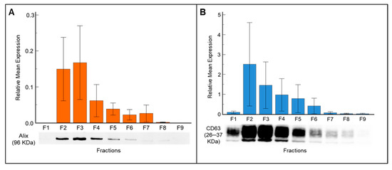 Fractions F1 to F9 of each sample were analyzed to assess the presence and expression levels of exosome-specific markers such as ALIX and CD63. ALIX was consistently detected in fractions F2 to F7 (Figure 2A), whereas CD63 was expressed across all fractions (Figure 2B). The presence of high intensity bands for ALIX protein in fractions F2 and F3 indicates that these two fractions were enriched with exosomes. The relative mean expression of ALIX compared with total protein in fractions F2 and F3 was 0.14 ± 0.25 and 0.16 ± 0.29, respectively (Figure 2A).