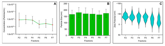 Based on the detection of exosome specific markers, fractions F2 to F7 were considered for particle analysis using a ZetaView Particle Metrix System to assess particle concentration, charge, and size range. Particle number was negligible in fraction 1 across all samples, corresponding to the column void volume. Thus, fraction F1 was excluded from particle analysis. The mean concentration of exosomes per mL in fractions F2 to F7 is presented in Figure 3A. Fractions F2, F3, and F4 showed the highest concentrations of exosomes, with 1.5 ± 1.7 × 1011, 1.14 ± 0.6 × 1011, and 1.02 ± 0.63 × 1011 particles/mL, respectively. In contrast, exosome concentrations in fractions F5 to F7 were relatively low. Moreover, fractions F8 to F13 were found to contain protein contaminants, confirmed by Western blot, showing fewer exosomes in these fractions (data not presented). Consequently, higher fractions were excluded from zeta analysis.