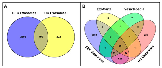 (A) Quantitative comparison showing the total number of proteins identified in exosome samples purified by SEC versus UC isolation protocols, demonstrating the protein recovery efficiency of each purification method. (B) Venn diagram analysis comparing the protein profiles of SEC- and UC-isolated seminal exosomes with established extracellular vesicle protein databases (Vesiclepedia and ExoCarta) to assess the overlap with known exosome-associated proteins. Venny 2.0 was used to generate Venn diagrams.