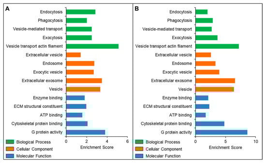 Gene Ontology and functional enrichment analysis of proteins identified in seminal plasma-derived exosomes isolated using the (A) SEC and (B) UC methods.