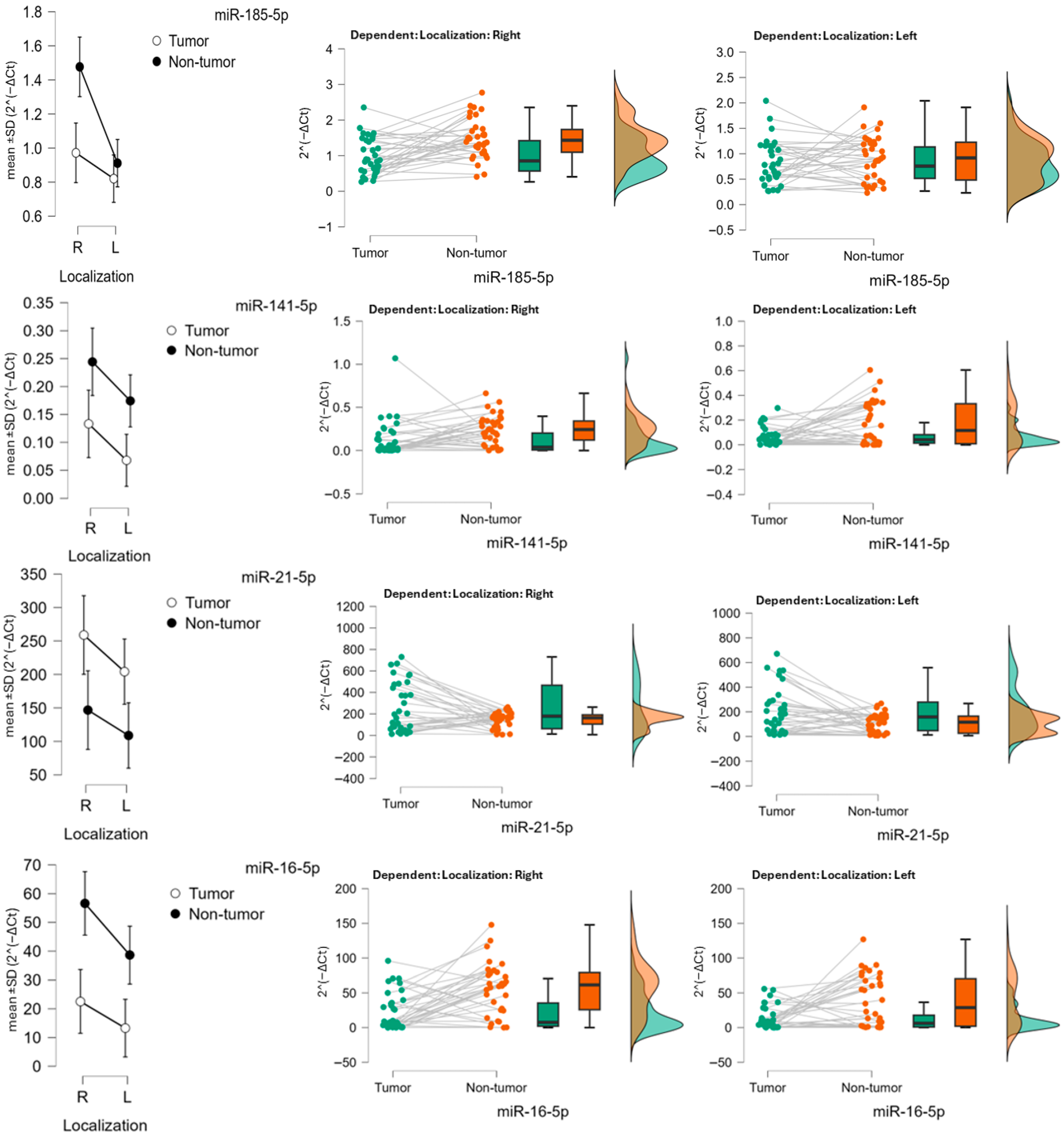 Kršul, D.; Prenc, E.; Požgaj, L.; Štefok, D.; Pongrac, P.; Podolski, M.; Radičević, A.P.; Karlović, D.; Jerković, A.; Golčić, M.; et al. Diagnostic Relevance of miR-185, miR-141, and miR-21 in Colon Carcinoma: Insights into Tumor Sidedness and Reference Gene Selection. Biomedicines 2025, 13, 2460. https://doi.org/10.3390/biomedicines13102460
