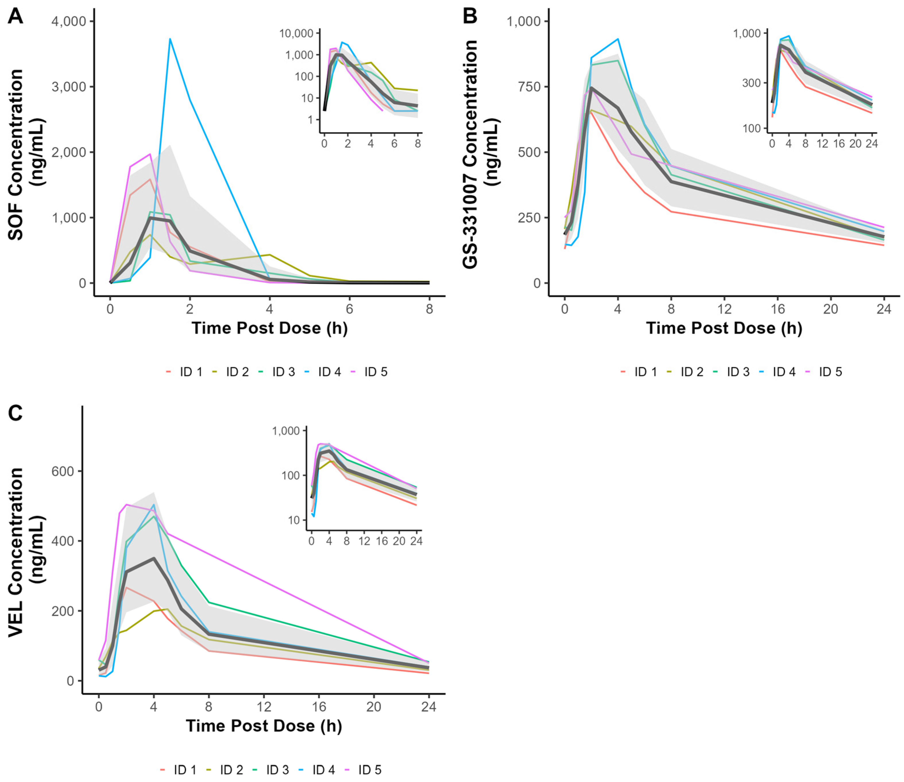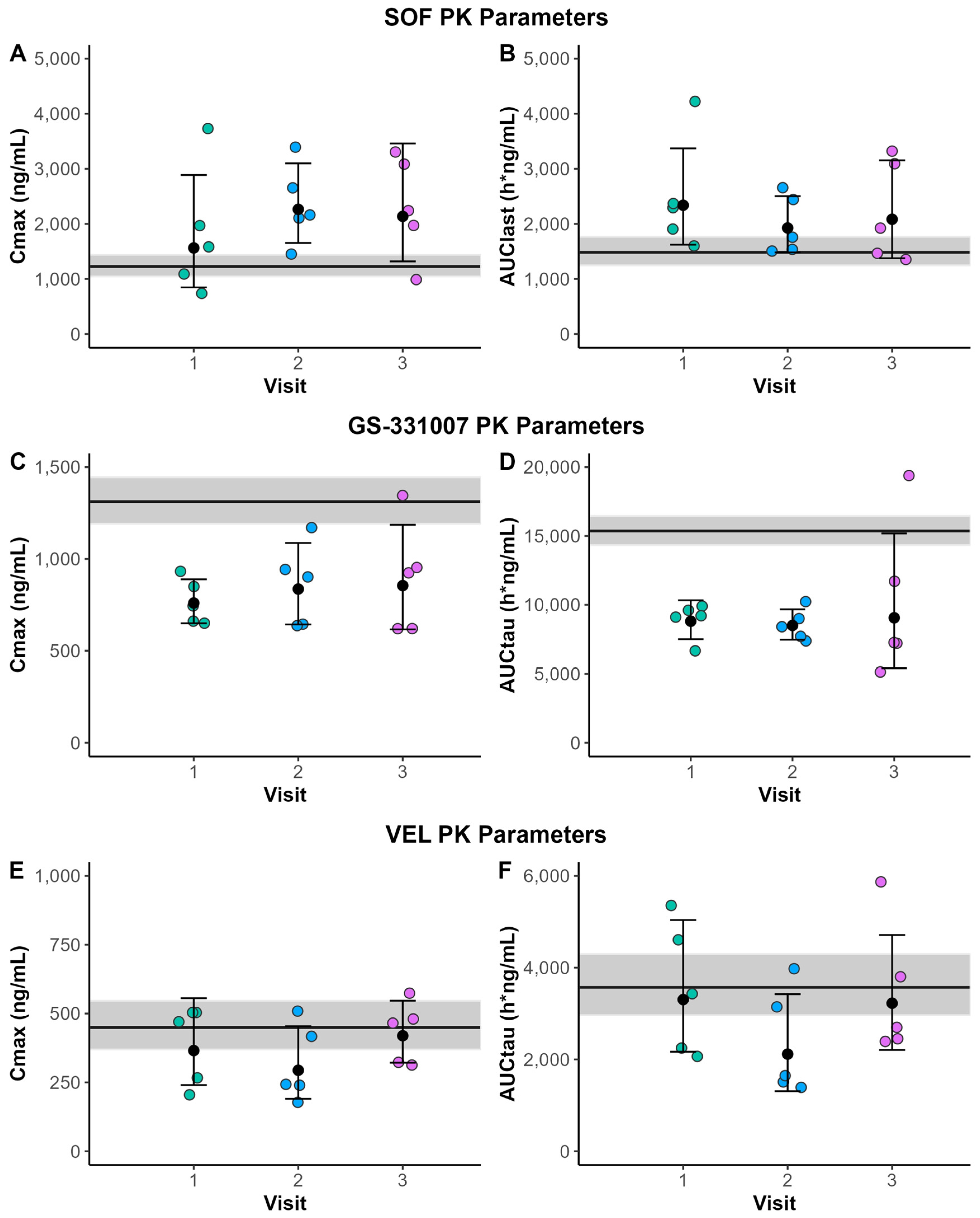 Plasma concentrations of SOF, GS-331007, and VEL were analysed by noncompartmental analysis (Phoenix Certara, version 8.4). The following PK parameters are reported for each analyte, unless indicated otherwise: maximum plasma concentration (Cmax), the predicted plasma concentration at 24 h post dose (Ctau), area under the curve over the 24 h dosing interval (AUCtau) or through the last measurable time point (AUClast), half-life (t1/2), apparent volume of distribution (V/F), and apparent oral clearance (CL/F).