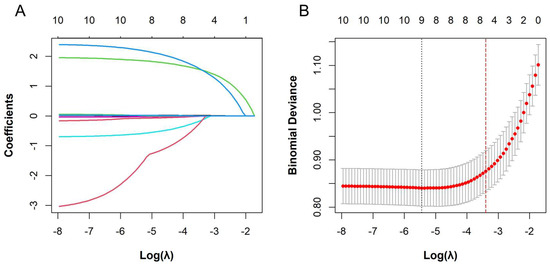 During data preprocessing, patient records with any missing values were excluded to ensure data quality and consistency. The resulting dataset was randomly divided into training and validation subsets in an 8:2 ratio. The training set served to construct a predictive model for ADA positivity, whereas the validation set was employed to evaluate its internal performance. To mitigate potential multicollinearity among predictor variables and to enhance model interpretability, a structured two-stage feature selection strategy was employed. Specifically, in the training dataset, variables showing univariate significance (p < 0.05) were retained as candidates for subsequent modeling. Feature selection was achieved by implementing the least absolute shrinkage and selection operator (LASSO) approach, where the lambda.1 standard error (λ.1se) criterion was applied to achieve a parsimonious model while maintaining predictive accuracy. Predictors that retained non-zero coefficients under this constraint were thereafter integrated into a multivariable logistic regression analysis, through which an optimized subset of independent variables was obtained to construct the final prediction model.